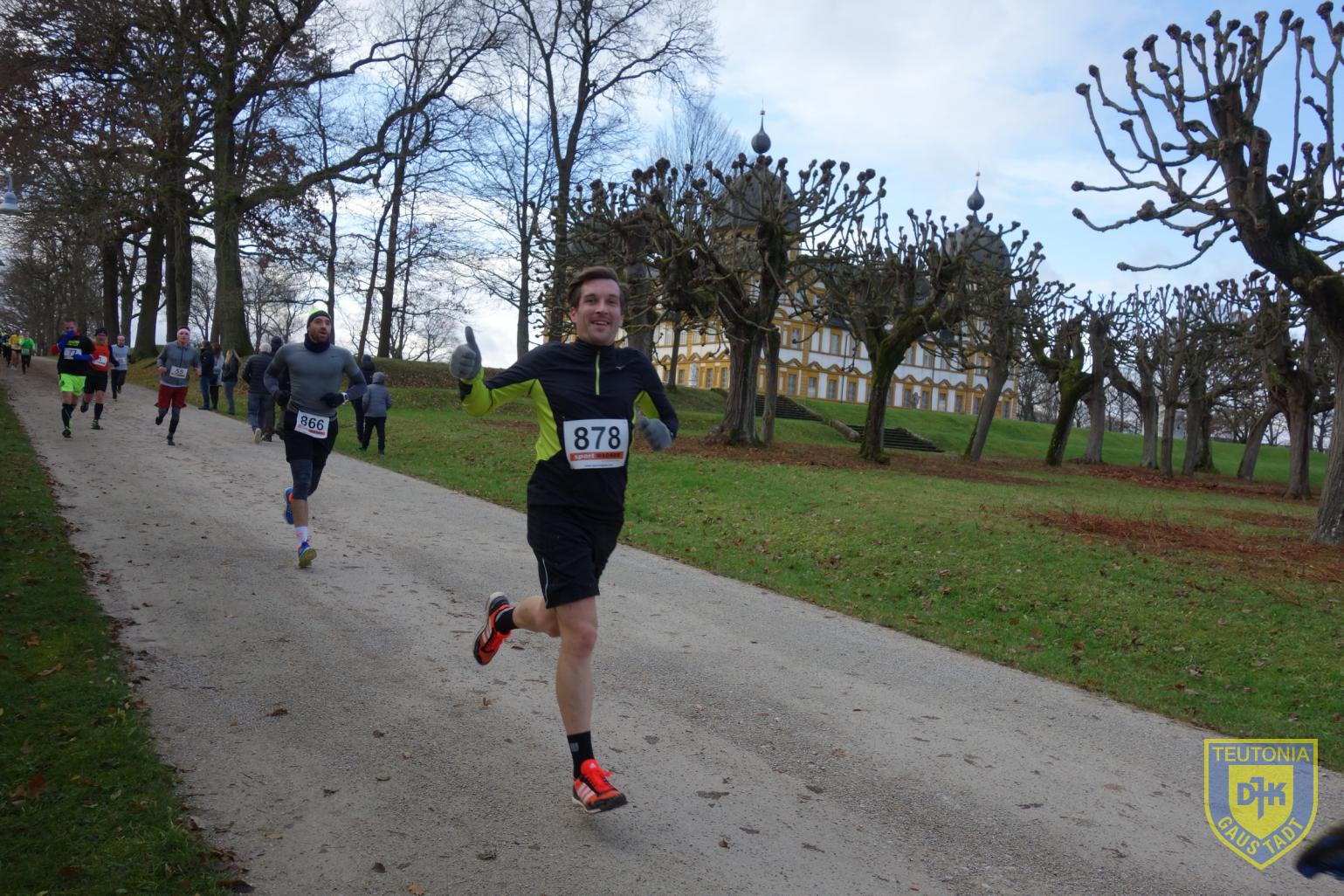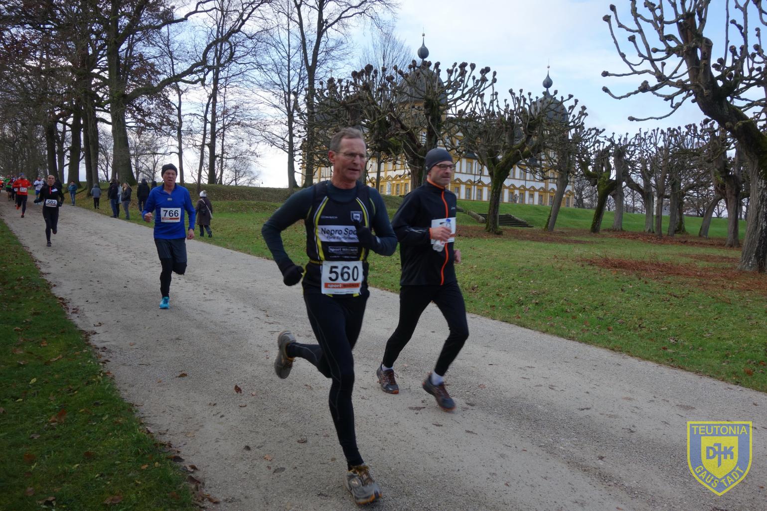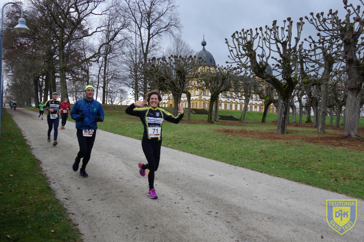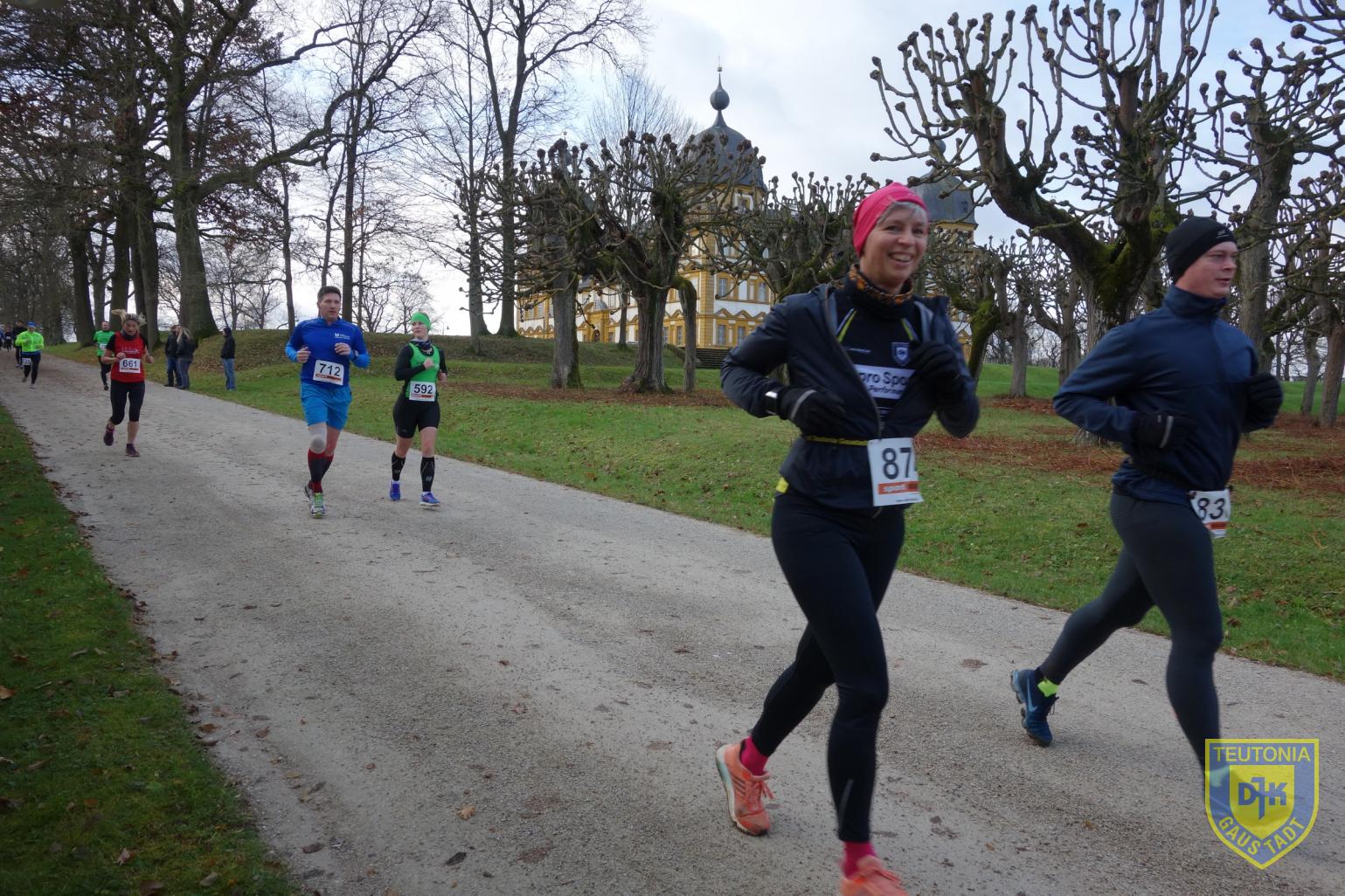 Der Schlosslauf Memmelsdorf ist eine der letzten Gelegenheiten, nochmal eine heiße Sohle auf den Asphalt zu brennen. Bereits zum 33. Mal organisierte der SC Memmelsdorf den Lauf rund um Schloss Seehof. Der Schlosslauf ist auch gleichzeitig der Abschlusslauf des Raiffeisen Cups, der insgesamt aus sechs Läufen besteht. Beim Hauptlauf über 10 km (verteilt auf drei Runden) nahmen auch dieses Jahr zahlreiche Teutonen teil. Die äußeren Bedingungen waren weniger angenehm, es hatte am Tag vorher ordentlich geregnet, so dass der Boden an einigen Stellen zu einer Herausforderung wurde. Auch die Temperaturen waren noch einmal gesunken im Vergleich zu den letzten Tagen. Trotzdem scheuten sich Elke, Judith Heinze, Judith Porzel, Micha, Christian, Christopher, Hans-Rainer, Jens, Karl, Michel, Peter, Stefan, Tobias und Torsten nicht und fanden sich pünktlich um 11:00 Uhr an der Startlinie mit knapp 300 weiteren Läufern ein. Ursel, Johanna und Max waren zur Motivation am Streckenrand und feuerten die Gaustädter ordentlich an.