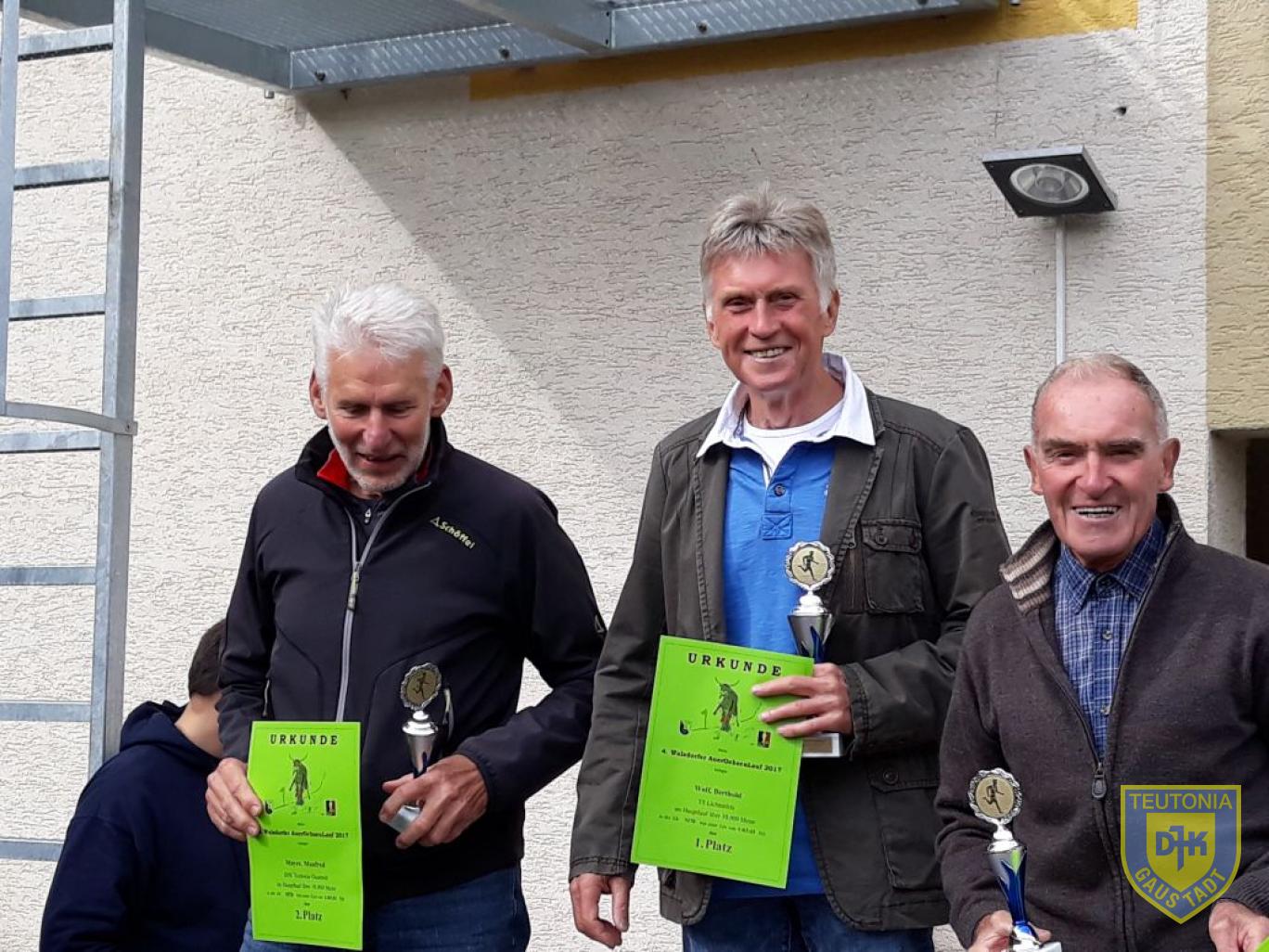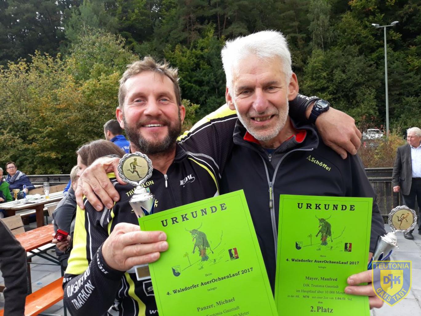 Vier Läufer der Teutonia haben sich am Sonntag, 1. Oktober 2017 zum 4. Auerochsenlauf, den die Leichtathletikabteilung des SV Walsdorf ausrichtete, bei optimalem Laufwetter getroffen. Gelaufen wurde eine Strecke über 10 km. Vom Sportgelände über die hintere Seite des "Schafbergs", durch den Anfang des Steigerwaldes und wieder zurück an den Auerochsengehegen vorbei, über die Walsdorfer "Flussgärten" zum Sportgelände. Die 82 Teilnehmer des Hauptlaufs mussten zudem noch 330 Höhenmeter überwinden. Die Wege waren nach durchregneter Nacht trotzdem gut begehbar und die Luft sauber. So machte das Laufen Spaß. Der Startschuss um 11.15 Uhr war auch zu einer annehmbaren Zeit gefallen.