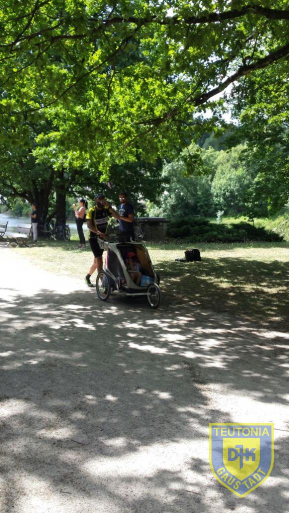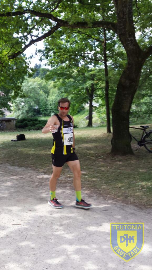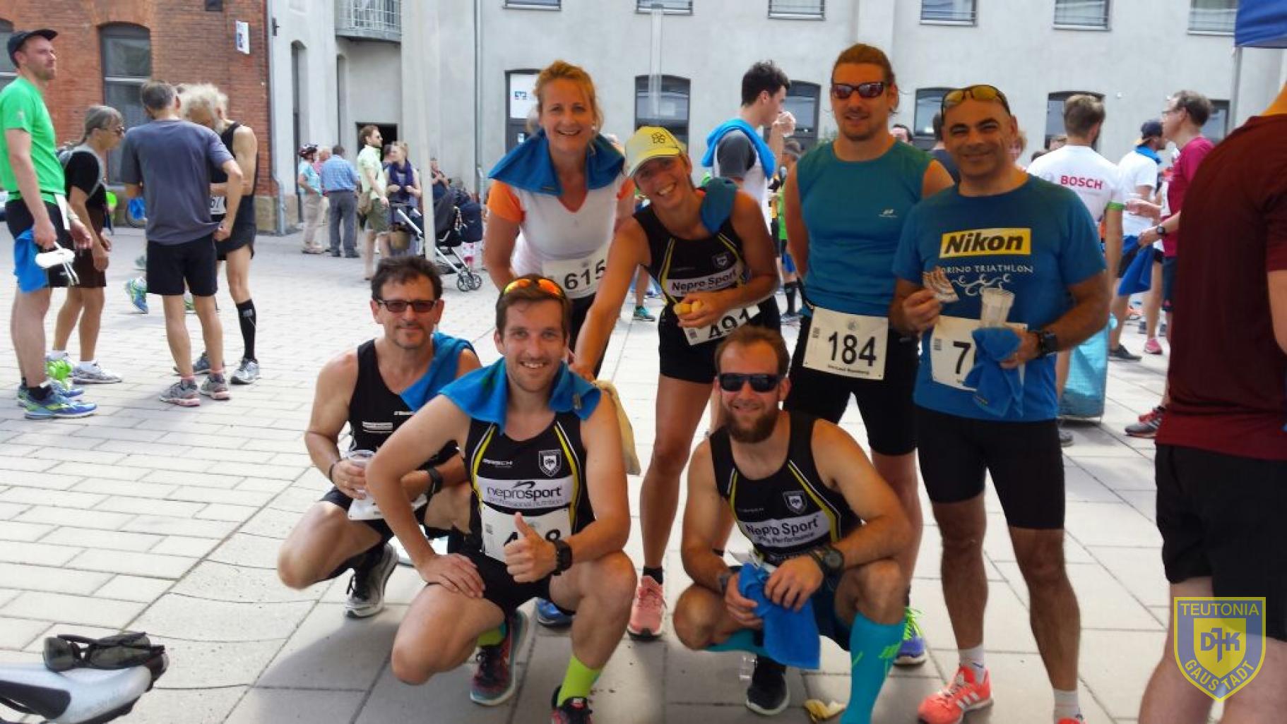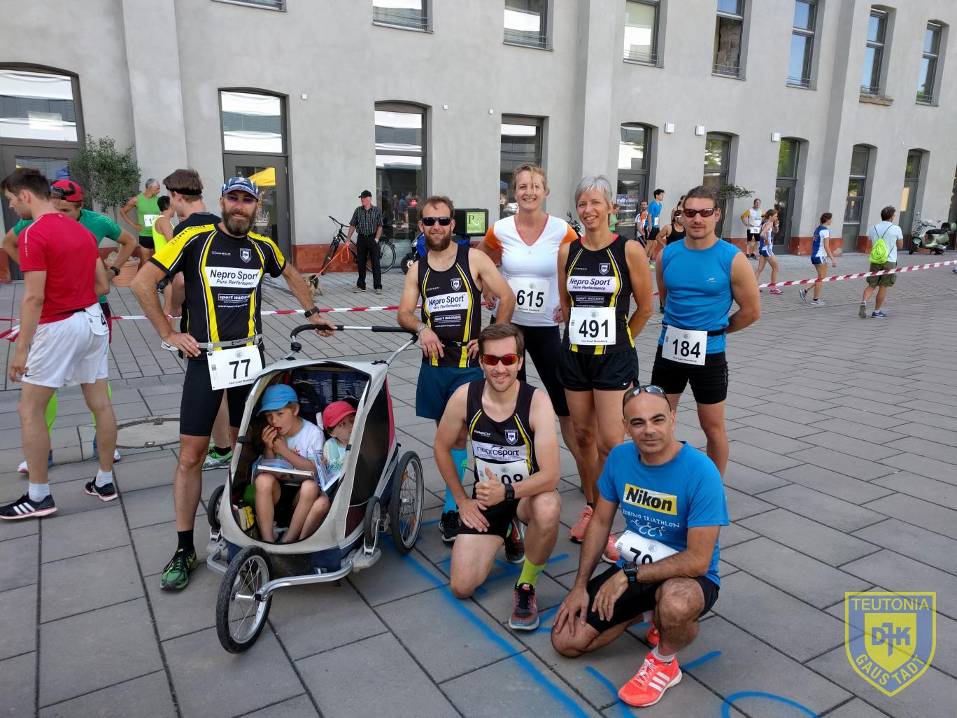 Ganze neun Teutonen wagten sich auf die flache und schnelle 10-Kilometerstrecke. Christian Habermüller und Basti Wehner liefen dabei vorneweg und bildeten die Zugmaschine des DJK-Express. Aber eine kurze Schrecksekunde direkt nach dem Startschuss: Basti kam ins straucheln und stürzte. Aber genauso schnell, wie er unten war, war er wieder auf den Beinen und gab Vollgas. Glück gehabt. Im Fahrwasser der beiden versuchte ich zunächst, dranzubleiben, aber das Wetter tat sein Übriges. Dicht auf den Fersen war uns Herbert, der heute inkognito als Harald Reges lief, „Damit der Junge auch mal ne anständige Zeit läuft“ waren seine Worte. Bernd wurde begleitet von seinen beiden Kindern, die er im Buggy locker vor sich herschob. Weiter in den DJK-Express reihten sich Iggy, Philipp, Waltraud und Elke. Ebenfalls für die DJK startete das Gaustadter Urgestein Nobert Stark.