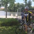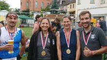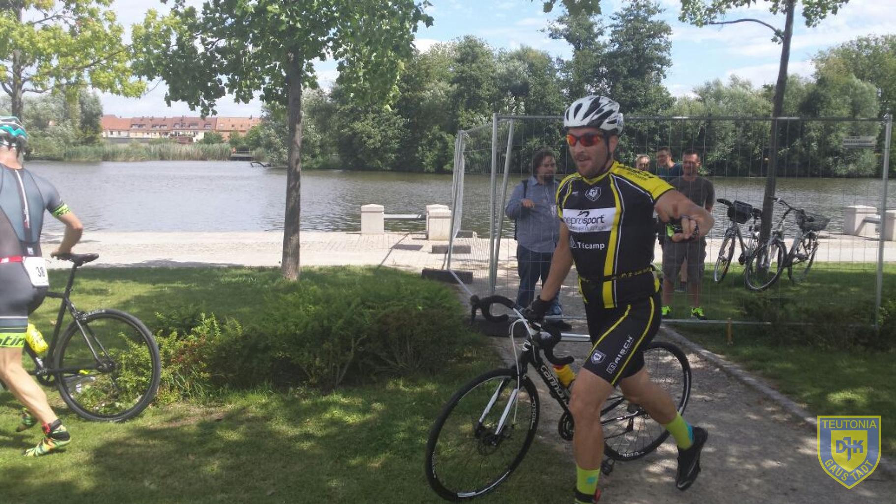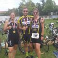 Geschwommen wird im Main, das ganze flussabwärts. Micha begab sich nach der Wettkampfbesprechung zum Schwimmstart begleitet von Sandra, die ihre persönlichen Sachen mit zurück in die Wechselzone nahm. Kurz vor dem Start war die Wechselzone wie leergefegt, nur ein paar andere Staffel-Teilnehmer warteten gemeinsam mit mir auf ihre jeweiligen Schwimmpartner. Der Start verzögerte sich dabei aufgrund des Schiffverkehrs um knapp 15 Minuten. Mittlerweile brannte die Sonne ganz ordentlich. Kurz vor der Volksdistanz starteten die Athleten der Landesliga Nord, die nach wenigen Minuten Schwimmen nur so durch die Wechselzone flogen. Aber nur knapp dahinter stiegen schon die ersten Volksdistanz‘ler aus dem Main. Jetzt wird’s also gleich ernst, Ausschau nach Micha haltend wurde ich doch langsam aber sicher leicht nervös. Nach nur 11 Minuten war Micha am Rad und überreichte mir den Chip. Jetzt bin ich also dran. Die ersten Kilometer führten flach aus Kitzingen heraus, leider blies ein ordentlicher Gegenwind. Nach etwa vier Kilometern ging es einen recht steilen Berg hinauf. Aber wo es rauf geht, geht es auch wieder runter. Und so konnte ich fast die gesamte Reststrecke ordentlich in die Pedale treten und übergab den Chip nach 38 Minuten an Sandra. Zeit zum Verschnaufen! Nach 01:16:39 liefen „die Unbelehrbaren“ schließlich zu dritt über die Ziellinie und nahmen unsere Medaillen in Empfang. In der Staffelwertung erreichten wir einen souveränen dritten Platz bei dem Mixed-Staffeln. Zufrieden warteten wir auf Christian und schlugen uns die Bäuche voll. Danke an meine beiden Mitstreiterinnen, hat riesigen Spaß gemacht!