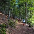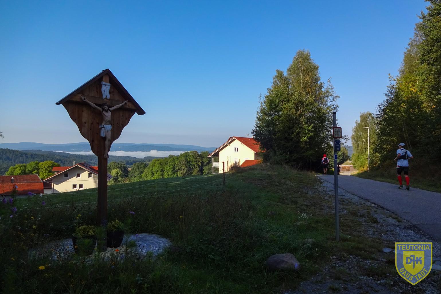 Nach dem Start geht es kurz durch den Ort, um warm zu werden, denn nach dem ersten Kilometer beginnt bereits der erste Anstieg zum 955 Meter hohen Silberberg. Auf dem Weg passieren wir eine Höhle, die von Fackeln beleuchtet wird und können von oben die Aussicht genießen. In den Tälern hängt der Nebel und nur die Bergspitzen erheben sich über dieses Meer. Über schöne Wege, auf denen man es gut laufen lassen kann geht es gleich wieder bergab, bevor der nächste Anstieg zum 983 Meter hohen Kronberg beginnt. Auf dem Weg zum Berg erreichen wir die erste Versorgungsstation und schnell wird klar, den Läuferinnen und Läufern wird es an nichts fehlen: Es gibt heißen Tee, ISO-Getränke, Wasser, Bier, verschiedene Obstsorten, Semmeln, Käsewürfel, Nüsse, Tomaten, Gurken, Kuchen, Süßes und Gels. Nach einem kurzen Aufenthalt geht es weiter auf schmalen Waldwegen bergauf. Die Strecke ist durchgängig mit kleinen roten Fähnchen und lila Pfeilen markiert, was ein verlaufen verhindert. In einem ständigen Auf-und-Ab führt die Strecke an der 869 Meter hohen Strohmannhanselhöhe vorbei und über die 914 Meter hohe Harlachberger Spitze.