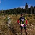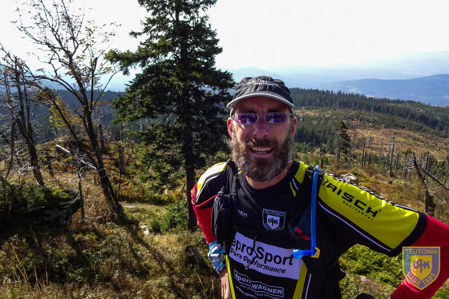 Kurz vor km 30 erreichten wir die sehr schön gelegene Versorgungsstation „Tausender“ und waren erstmalig auf 1000 Meter. Nach wenigen Minuten schwenkten wir zwischen Enzian und Kleiner Arber auf den Goldsteig, dem wir über den 1384 Meter hohen Kleinen Arber folgten. Uns bot sich eine spektakuläre Aussicht über die umliegende Landschaft mit den vielen abgestorbenen Bäumen und der sich verfärbenden Natur. Kurz vor dem Gipfel hieß es kraxel: Es ging über hohe Felsen direkt zum Gipfel mit Gipfelkreuz. Nach einer Verschnaufpause und einem Rundblick auf der anderen Seite wieder runtersteigen und auf einem technisch anspruchsvollen Downhill etwa 150 Hm bergab. Wir wussten ja, was nun kommt… der Anstieg zum Großen Arber… Nochmals knapp 2 km steiler Anstieg mit vielen Treppenstufen, aber einer tollen Landschaft! Oben angekommen, hieß es erst mal durchatmen. Etwas ungewohnt war es hier oben, waren doch so viele Menschen hier. Da merkte man wieder, auf den Berg führt eine Seilbahn… Die Strecke verlief kurz unterhalb des Gipfelkreuzes vorbei und anschließend sofort wieder bergab zum Arberschutzhaus, wo die nächste Versorgungsstation wartete. Hier fiel es schwer, sich von den ganzen Leckereien loszureißen und weiterzulaufen, aber die Kraft war noch da und das Laufen machte einfach Spaß! Über den Arberweg ging es nun auf dem technisch schwierigsten Abschnitt des gesamten Rennens zum großen Arbersee auf 940 Meter. Der Weg war größtenteils ein felsiger Pfad, der absolute Trittsicherheit und Konzentration erforderte, aber absolut genial zum Laufen war!