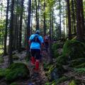 Bis etwa km 25 wechseln sich die Anstiege und gut laufbaren Passagen immer wieder ab und es macht einfach nur Spaß, dabei zu sein! Bei Joska Kristall erwartet uns die dritte Versorgungsstation und schön langsam beginnt der Anstieg zum Kleinen und Großen Arber. Auf traumhaften Trails laufen wir durch den Naturpark Bayerischer Wald und kommen am Hochfall, einem Wasserfall vorbei. Kurz darauf wurde es etwas enger auf der Strecke, denn die Läuferinnen und Läufer des Auerhahntrails über 35 km stießen zu den Ultraläuferinnen und -läufern. Nach ein paar Minuten hatte sich das Feld wieder entzerrt und weiter ging es den höchsten Bergen des Bayerischen Waldes entgegen. Inzwischen stand die Sonne schon hoch und bei den Passagen außerhalb des Waldes war es angenehm warm.
