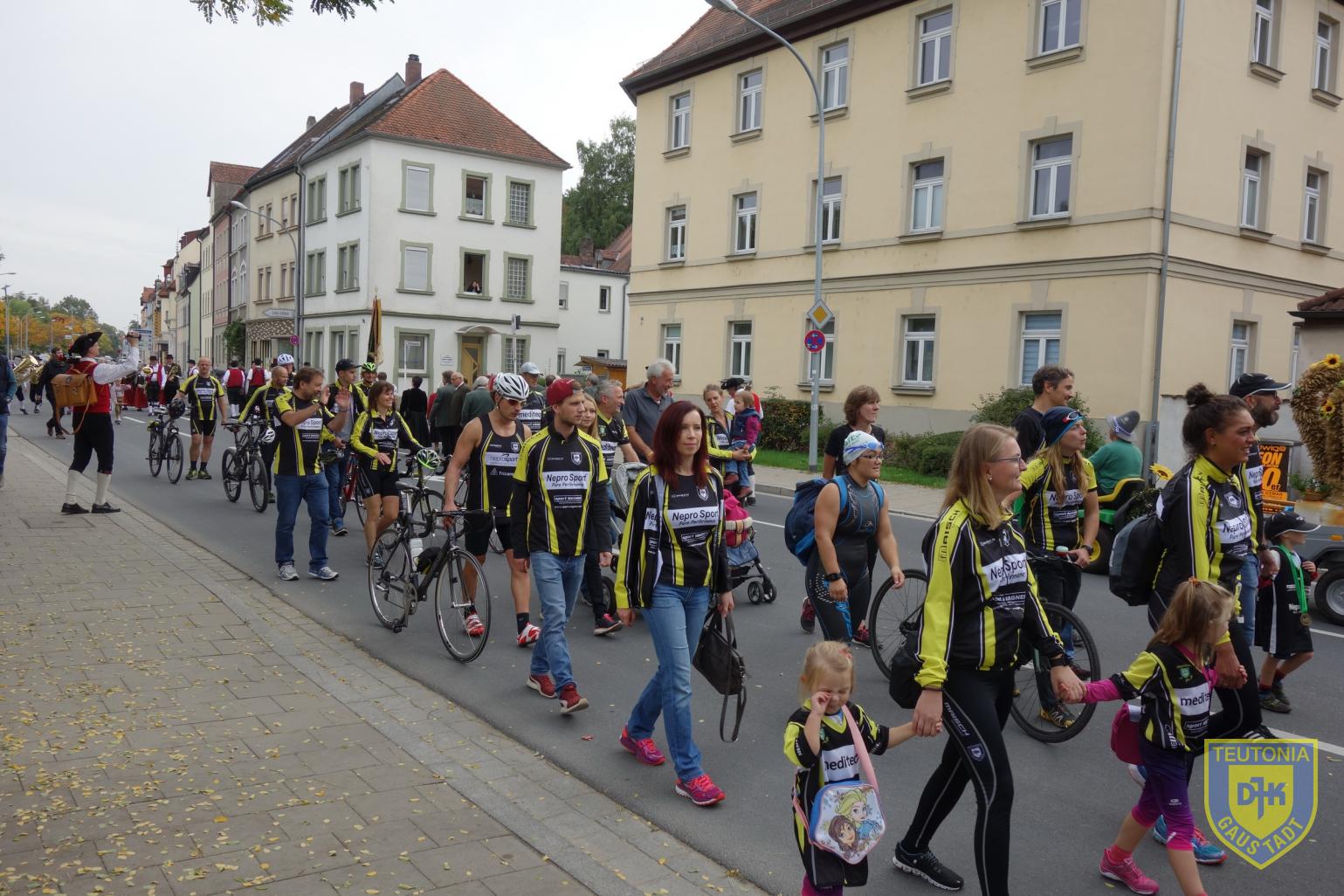 Der Mitgliederzuwachs zeigte sich auch beim Kirchweihumzug. Eine stattliche Anzahl von DJK'lern präsentierte die Triathlonabteilung beim traditionellen Umzug durch Gaustadt. Natürlich waren auch wieder Kinder und Enkel dabei. Auch unser Bürgermeister Christian Lange schaute kurz vor dem Start vorbei. Von Musik begleitet führte der Weg zur Hauptstraße und zum Wendepunkt an der Erbabrücke, bevor er am Kirchweihplatz endete. Nach dem Umzug setzen sich die Triathletinnen / Triathleten noch im Festzelt zusammen. Bei Kaffee und Kuchen wurden lockere Gespräche geführt, ehe die schöne Gemeinschaftsaktion endete.
