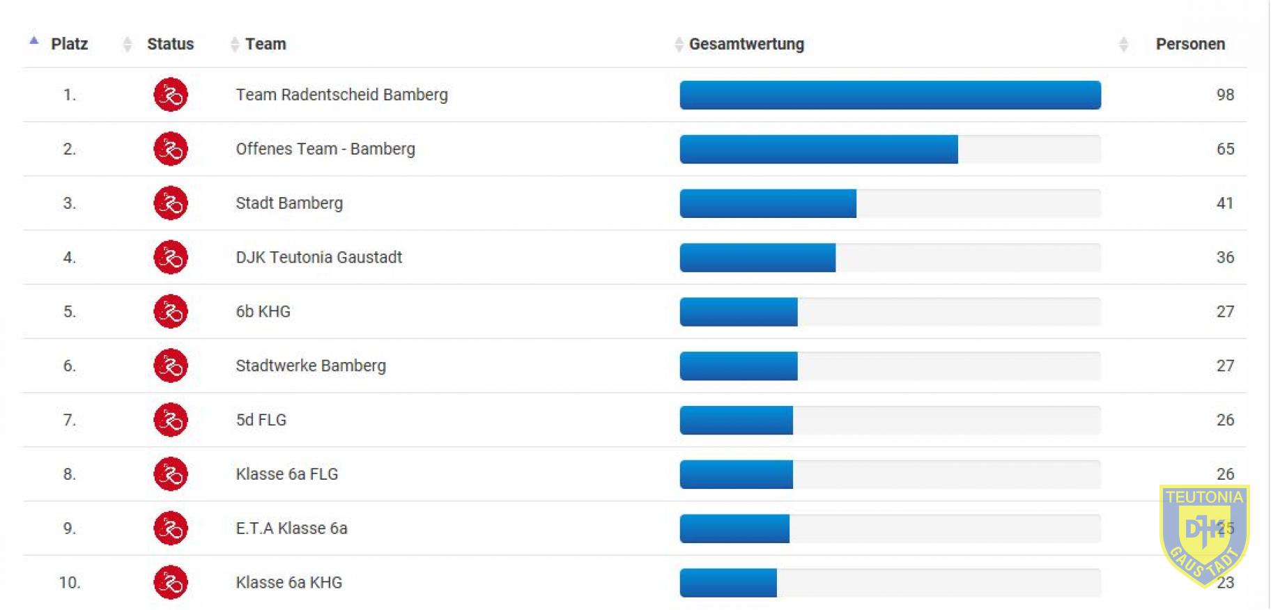 Das Team DJK Teutonia Gaustadt erzielte bei den geradelten Kilometern mit 18102 und bei den Kilometern pro Teilnehmer mit 503 jeweils den 2. Platz.