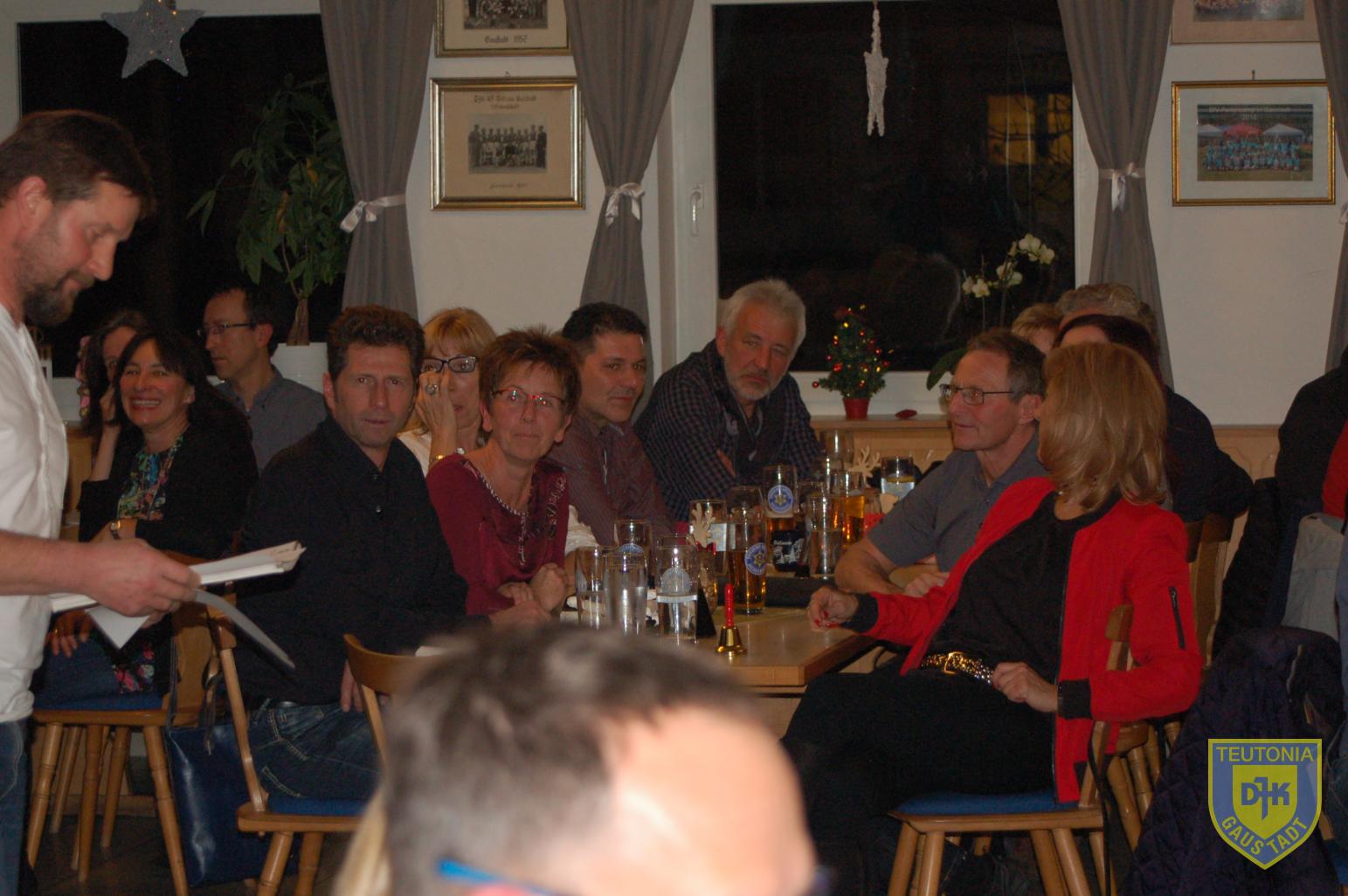 Der Platz im Vereinsheim reichte in diesem Jahr gerade noch aus, um die zahlreich erschienenen Triathletinnen und Triathleten samt ihren Familienangehörigen aufzunehmen. Die Weihnachtsfeier begann gegen 18 Uhr mit einem Glühweinumtrunk, natürlich auch ohne Alkohol.