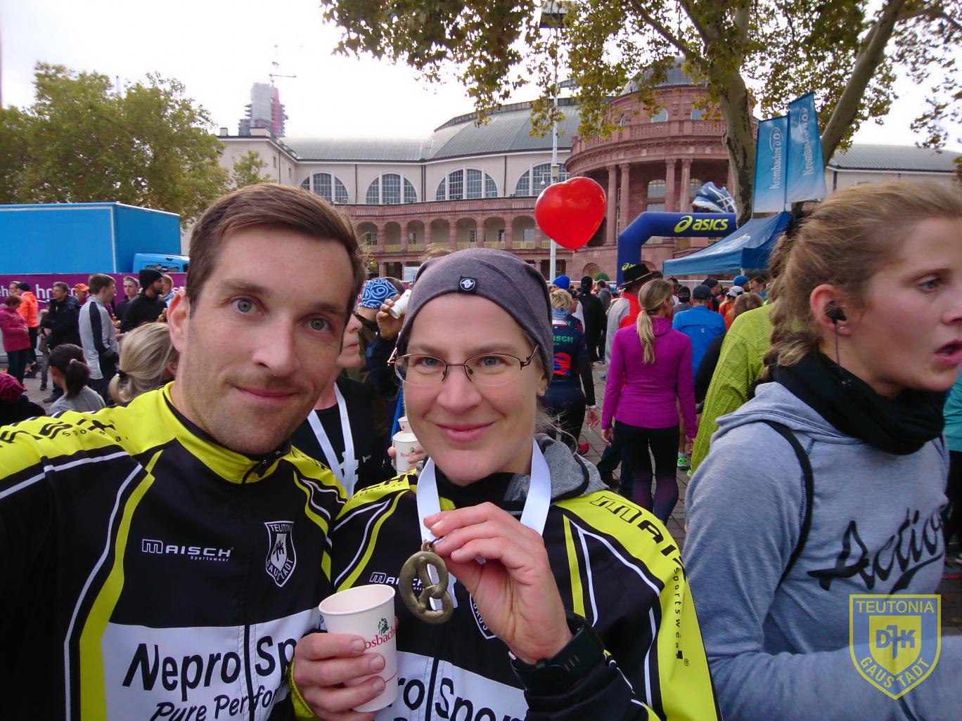 Dann war es soweit und das Rennwochenende stand vor der Tür. Perfektere Rahmenbedingungen kann man sich kaum wünschen. Das Hotel war keine 10 Minuten Fußweg von der Messe entfernt und bei der Frage, wann am Sonntag spätestens ausgecheckt werden musste, kam die goldene Antwort: Am Marathontag bis 18:00 Uhr! Damit war jegliche weitere Planung überflüssig, nach dem Zieleinlauf konnte ich also im Hotel duschen, mich noch eine halbe Stunde im Bett erholen und in aller Gemütlichkeit abreisen, klasse! Kopf also einigermaßen frei. Mit mir seit Freitag in Frankfurt: Samstags-Brezelläuferin und Sonntags-Premium-Fan Sandra.