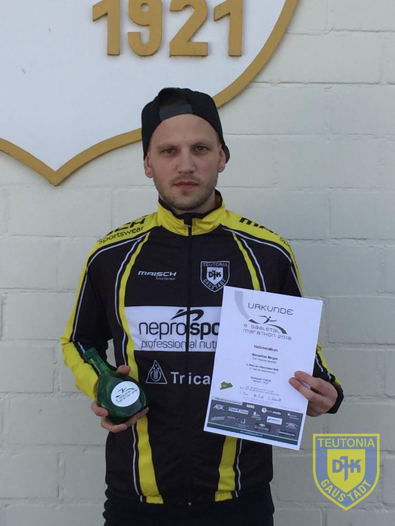 Um 10 Uhr erfolgte dann der Start für Halbmarathon und Marathon, wir planten den ersten Berg gemeinsam anzugehen und uns danach dann zu trennen. Ich fand allerdings Anschluss an eine relative große und schnelle Gruppe und hab gleich Gas geben. Die Strecke war sehr schön und abwechslungsreich, allerdings hatte ich nicht mit so vielen Anstiegen und Trail-Abschnitten gerechnet. Am Ende waren es dann knapp 370 Hm. Leider bekam ich bei Km 8 Schmerzen in der rechten Wade, die anschließend immer fester wurde. Ab Km 17 wurde dann die linke Wade auch immer fester.... Die meiste Zeit war ich alleine unterwegs, erst bei Km 17 tauchte wieder mal jemand auf und überholte mich, ich versuchte dran zu bleiben. Der Veranstalter kam uns auf seinem Segway entgegen kam und teilte uns mit, dass wir Position zehn und elf sind. Der andere Läufer sah noch recht frisch aus und ich lies mich überreden gemeinsam auf die beiden vor uns aufzuschließen. Ein Kilometer vor dem Ziel hatte ich die beiden dann erreicht und meinen Mitstreiter verloren. Die Aufholjagd kostete aber so viel Kraft, dass ich keine Kraft mehr für einen Zielsprint hatte. Am Ende war es dann der unerwartete 10. Gesamtplatz und 2. in meiner Altersklasse.
