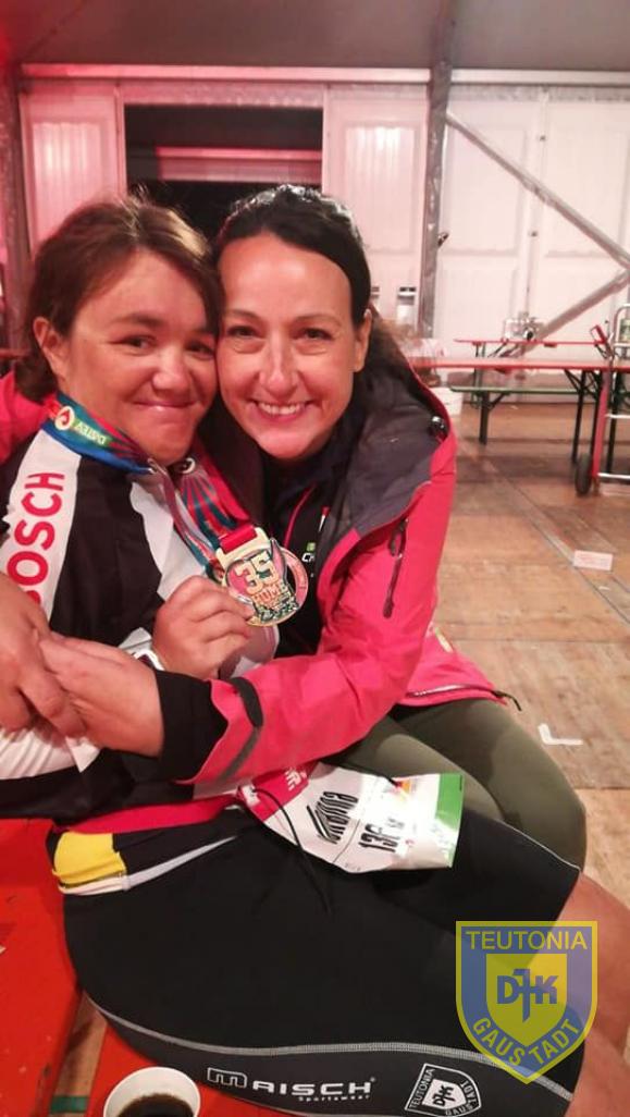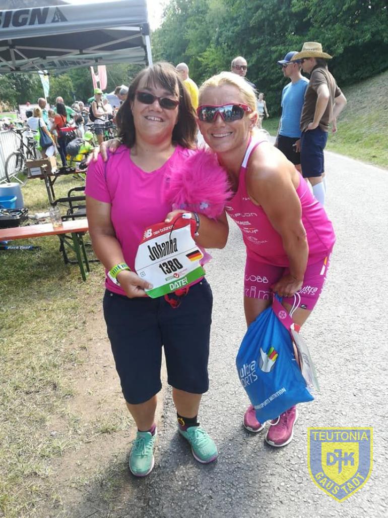 Mit etwas Verspätung fuhr ich dann Dienstagvormittag nach Roth, denn erholen konnte ich mich auch dort. Ab Mittwoch wurde es dann Stück für Stück besser und am Donnerstag viel die Entscheidung zum Start. Mit einer Bekannten holte ich die Startnummern ab. Am Samstag gab es dann gemeinsam mit Yvonne den VIP Check in. J - Jetzt gab es kein Zurück mehr. Der Sonntag begann früh um 2:30 Uhr klingelte der Wecker und es hieß fertig machen für den großen Tag. Gemeinsam mit Sabine machte ich mich auf dem Weg zum Shuttel Bus. Dort angekommen, gab es noch ein schnelles Foto mit Laura Sidall die ebenfalls den Shuttel nutzte. In der Wechselzone angekommen hieß es letzte Vorbereitungen treffen und dann war er auch schon da der Startschuss. Gemeinsam mit den Profi Damen ging es auf die 3,8km im Main Donau Kanal. War das Schwimmen noch solide, wurde das Radfahren schon zu Beginn zum Kampf und ich überlegte mehrmals auszusteigen. Aber irgendwie schaffte ich es in die Wechselzone 2 und von dort auf den Marathon, der allerdings auch Erst einmal überhaupt nicht lief zwischen km 8 und 15 lief es dann wieder zumindest solide und ich schöpfte Hoffnung. Bei Km 15 musste ich mich dann leider Übergeben und ab diesem Zeitpunkt ging gar nichts mehr. Dank der Weltbesten Supporter Crew ging es aber Kilometer für Kilomter weiter und Axel zwang mich bei jedem Kilometer zumindest etwas Gel zu schlecken. Endlich war dann der Kanal geschafft und es ging nach Roth wo wir von Kampfrichtern angehalten wurden, die mich aus dem Rennen nahmen. Da ich aber wie schon gesagt die Welt Beste Supporter Crew hatte konnte ich guten Gewissens unterschreiben, dass ich auf eigene Verantwortung weiterlaufe. So ging es auf die wohl dunkelsten und hügeligsten Kilometer des Tages nach Büchenbach. Nach unendlichen Kampf durfte ich dann zusammen mit meiner Familie und meinen Supportern ins leere Stadion einlaufen. Im Ziel wartete dann noch eine Überraschung auf mich. Der Athleten Service stand noch ein letztes mal Spalier und Felix überreichte mir meine Medaille in diesem Moment konnte ich die Tränen nicht mehr zurückhalten.