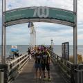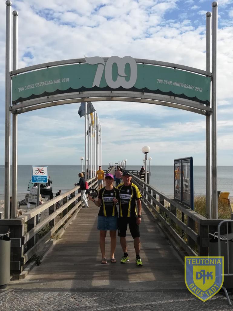 Wenn an so einem Tag die Sonne lacht und noch dazu das Meer ruhig bleibt kann das nur zu Bestzeiten führen. Da der Schwimmstart nach den Profis erst um 10.15 als Rolling Start erfolgte konnte man fast ausschlafen. Die Strecke war zwar gute 300m zu lang, aber das hatten alle und es fühlte sich an diesem Tag absolut rund an. Mit einer Pace von 1:33min auf 100m kam ich im Nachhinein quasi zeitgleich mit einer weiteren Athletin meine Altersklasse führend aus dem Wasser. Durch den Rolling Start war dies zu dem Zeitpunkt noch nicht einsichtig. In Binz wurden alle 6 Sekunden 4 Athleten ins offene Meer geschickt. Dadurch wird der Start entzerrt, man hat aber keine Übersicht zu den Zeiten anderer Athleten. Meine direkte Konkurrenz startete nicht mit mir, so dass ich auf der Strecke keine Ahnung von der Platzierung hatte.