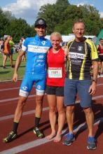 An erster Stelle liegend übernahm Carina den Transponder und startete auf die 7,3 km lange anspruchsvolle Laufstrecke. Der Anstieg zur Wallburg ist auf der Laufstrecke die größte Herausforderung und die warmen Temperaturen machten es nicht einfacher. Carina wechselte zwischen den Treppenstufen und dem Trampelpfad daneben hin und her. Nachdem sie die Burg umrundet hatte, ging es über Feldwege und durch das Neubaugebiet von Eltmann erstmal bergab. Carina konnte sich etwas treiben lassen und das Laufen fiel ihr hier sehr leicht. Wie auch vor zwei Jahren standen viele Hausbesucher mit Rasensprengern am Straßenrand und boten den Läufern eine Abkühlung. Auch sonst waren wieder sehr viele Zuschauer an der Strecke oder feuerten die Sportler vom Balkon oder Fenster aus an. Die letzten zwei Kilometer verliefen parallel zum Main entlang und hier musste sie ein wenig kämpfen, um das Tempo zu halten. Beim Einlauf ins Stadion wurde sie aber dann nochmal richtig von den Zuschauern "getragen" und im Ziel gebührend von Uli und mir empfangen. Nach 1:35:59 lief Carina ins Ziel. Den Streckenrekord von 2016 hatten wir um über eine Minute verbessert.