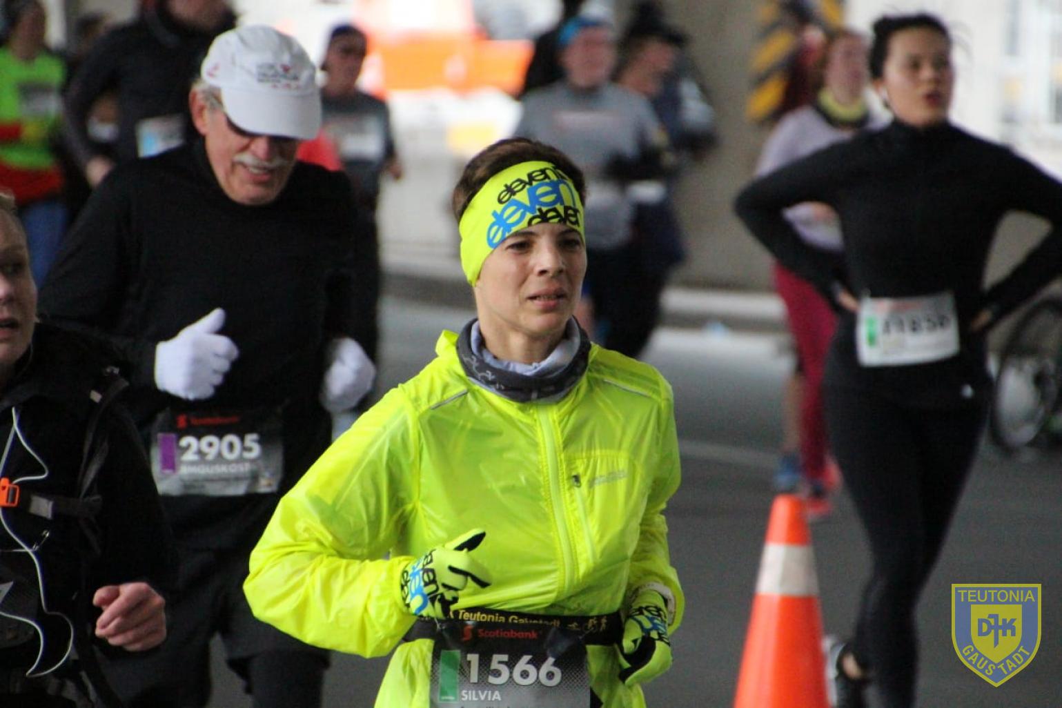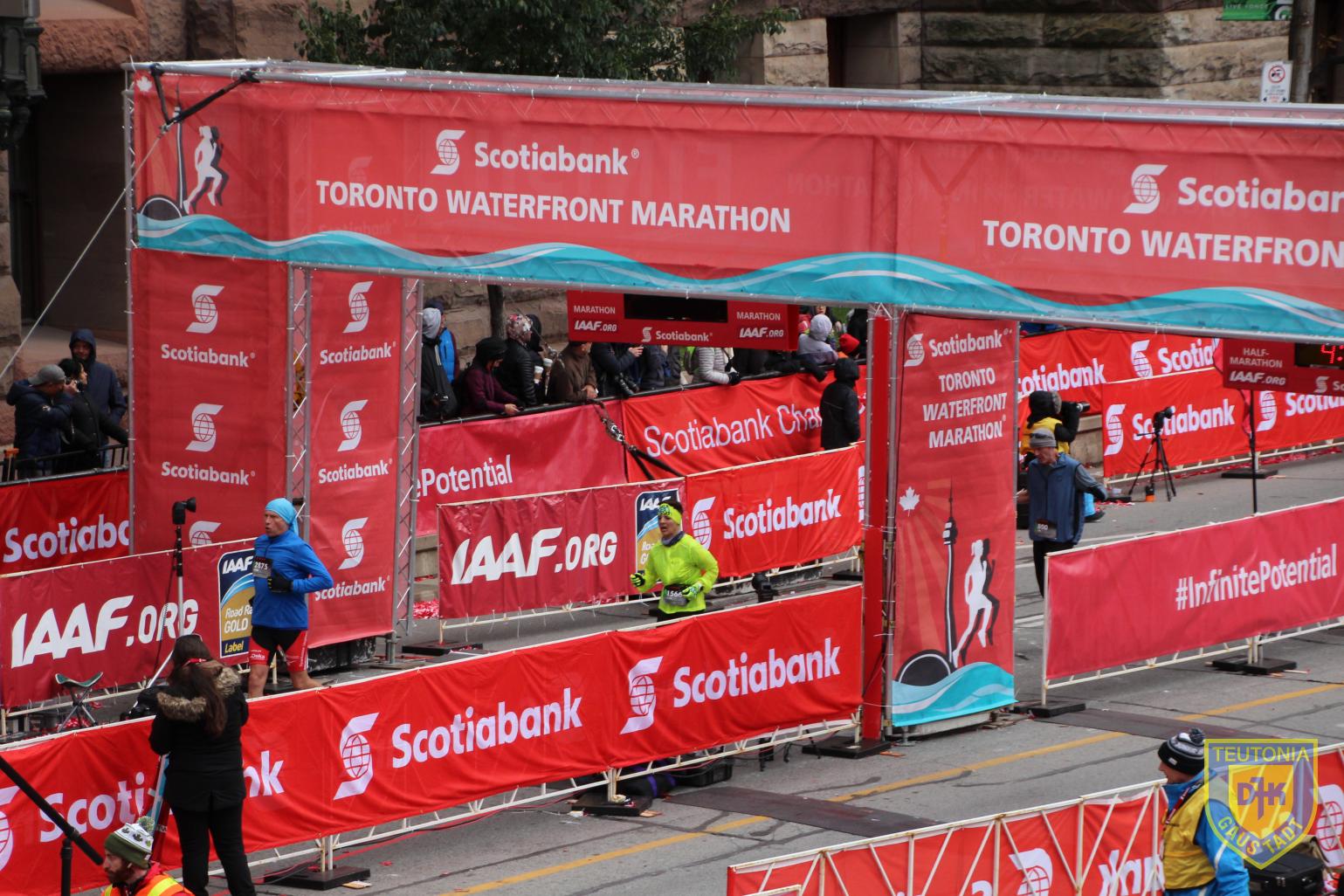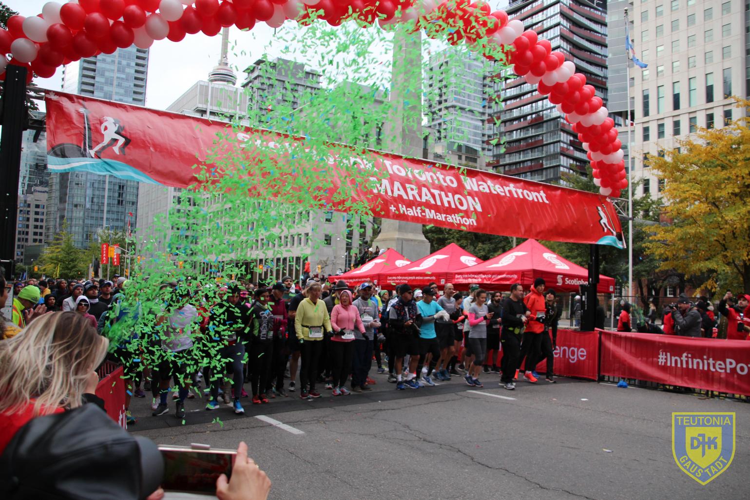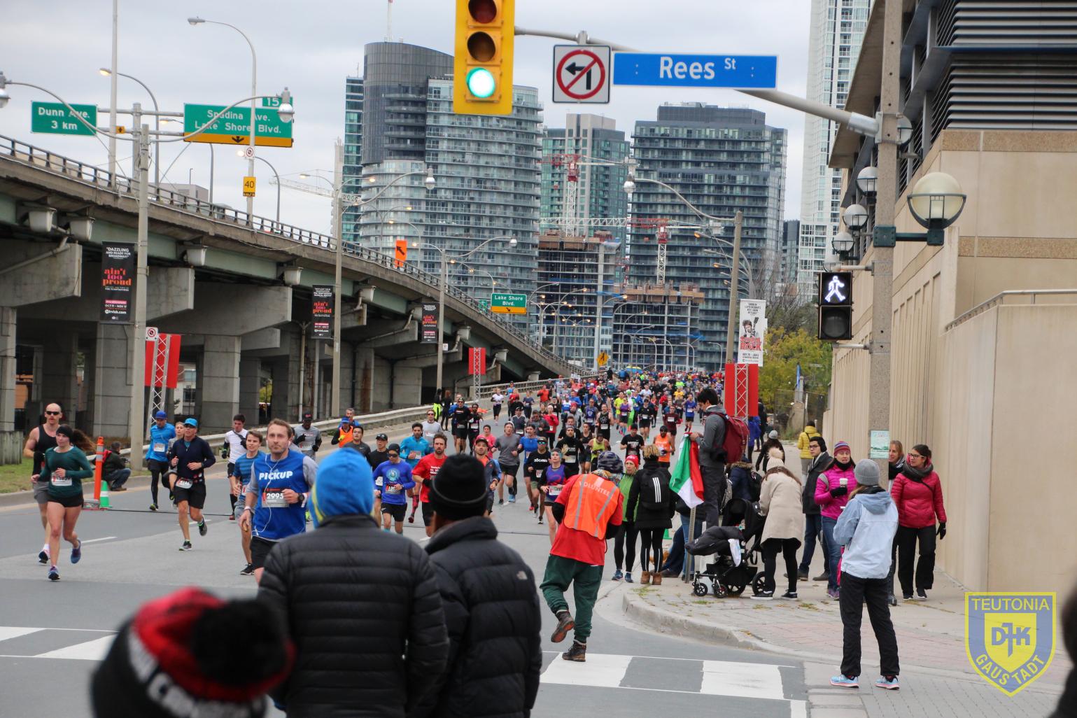 Startschuss war am Sonntagmorgen um 8.45 Uhr bei windigen 0 Grad. Nach der kanadischen Nationalhymne liefen die Corrals schwarz, rot, gelb, blau, grün, orange und lila nacheinander mit jeweils passendem farblichen Konfettiregen los. Kurzentschlossen habe ich mich bei einem Pacer für 4 Std 10min angehängt, wohl wissend, dass ich das Tempo nicht auf die volle Distanz schaffe…😉. Die Stimmung auf der ersten Hälfte war absolut gigantisch! Alle 3 km Verpflegungsstellen die Wasser und Gatorade anboten, insgesamt gab es zusätzlich noch 4- oder 5-mal Energiegels. Bis Kilometer 21 lief auf der fast flachen Strecke alles super, ich blieb gut an dem Pacer dran…. bis der Blödmann an einem Medical-Zelt bei km 22 einfach ausstieg! Bei eisigem Wind hieß es dann halt alleine durchbeißen. Die zweite Hälfte war stimmungstechnisch etwas ruhiger, jedoch mit toller Aussicht auf den Ontario See. Eine Überraschung gab es dann noch, als ich mir auf den letzten Kilometern ein kanadisches „Energy-gel“ gönnte. Auf der Packung stand tatsächlich Energy–gel, bestehend aus: 100% kanadischem Ahorn Sirup!