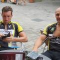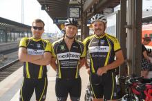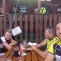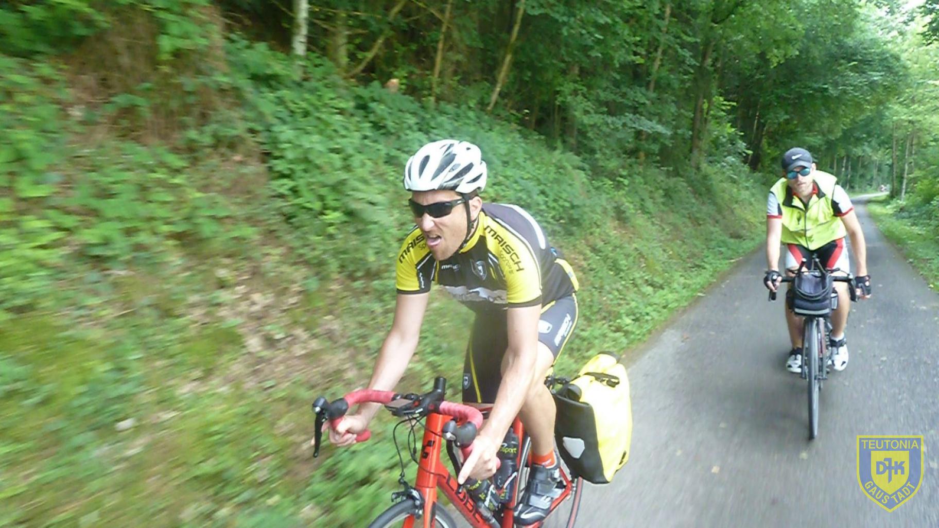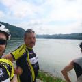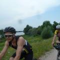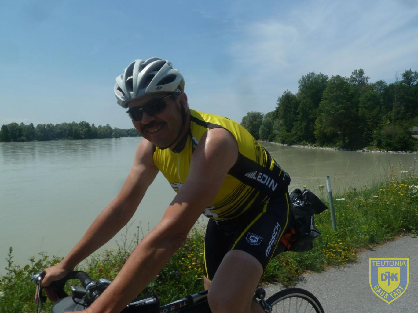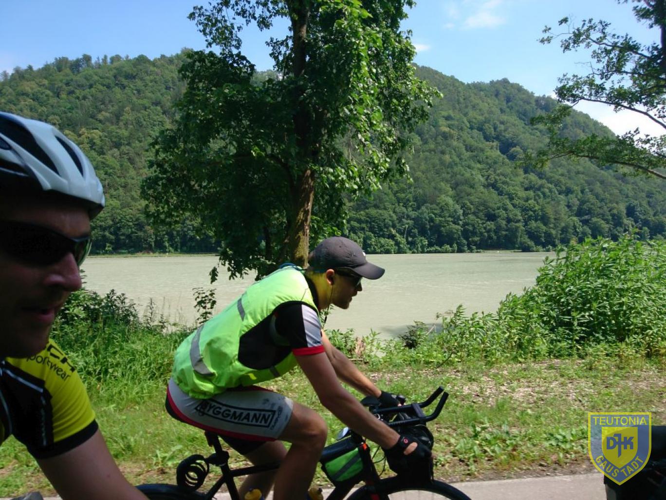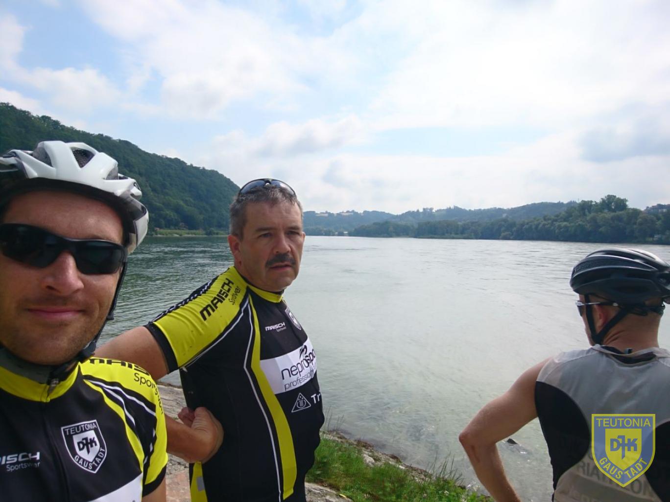 Es hatte die Nacht durchgeregnet und das Geräusch von leichtem Nieselregen am Morgen drang durch das geöffnete Fenster in den dritten Stock unserer Unterkunft. Gegen halb acht ging es runter zum gemeinsamen Frühstück. Beim Frühstücksbuffet blieb kein Wunsch offen und so ging es mit guter Stimmung weiter zur zweiten Etappe. Das knapp 125 km entfernte Linz war das nächste Ziel. Gegen 09:00 Uhr rollte der DJK-Zug an und auch der Regen hatten mittlerweile aufgehört. Bereits nach 25 km die erste kurze Pause mit obligatorischem Fototermin am Zusammenfluss der Inn, Ilz und Donau mit anschließendem Kaffee-Stopp in der Innenstadt. Wir sind mittlerweile in Passau und nach kurzem Aufenthalt ging es weiter. Die Grenzüberschreitung geschah vollkommen unwissentlich, nur an den Ortsschildern war zu erkennen, dass wir uns bereits in Österreich befinden mussten. Der Radweg hier glich einer Autobahn und lud gerade zu ein schnell zufahren. Noch vor dem Mittag machten wir dann unterwegs eine Bekanntschaft, die uns bis zum Ende der Tour erhalten bleiben sollte. Ein Rennradfahrer mit Anhänger fuhr uns voraus, offensichtlich auch recht flott unterwegs, so dass wir nicht ganz so einfach aufschließen konnten, wie mancher gedacht hatte. Mit seinem kleinen Rückspiegel hatte er uns (wie er uns später gestand und aufgrund dessen wesentlich schneller fuhr als sonst) bereits gesehen. Beim Überholen kurzer musternder Blick und weiter, nur Ralf kam kurz mit ihm ins Gespräch. Ebenfalls unterwegs nach Linz und so war der Mitfahrer gefunden. Bei der ersten Pause kamen wir dann etwas mehr ins Gespräch. Ole, 27 Jahre und Psychologie-Student aus Norwegen war doch tatsächlich mit dem Rad auf dem EuroVelo 6 unterwegs, vom Atlantik ans Schwarze Meer. Wir teilten unser Essen mit Ole und fuhren von jetzt an gemeinsam. Weiter ging es nördlich der Donau bis zur Schlögener Schlinge. Hier mussten wir das einzige mal eine Fähre nehmen, da der Radweg im Norden einfach zu Ende ging, so jedenfalls die Aussage des Fährmanns. Eine sehr schöne Unterbrechung. Nur wenige Minuten dauerte das Übersetzen und es ging gleich mit vollem Elan weiter. Gegen 16:00 Uhr erreichten wir gemeinsam Linz und unsere Wege trennten sich zunächst. Unsere Unterkunft befand sich in unmittelbarer Nähe zum Donauradweg, Ole übernachtete in der südlichen Linzer Innenstadt. Wir hatten das gleiche Etappenziel am nächsten Tag und beschlossen gemeinsam weiter zu fahren. Im Hotel angekommen die ersehnte Dusche. Auf dem Abendprogramm stand ein Besuch am naheliegenden Badesee mit anschließender Verköstigung dort. Ein obligatorischer Abstecher in die Linzer Innenstadt beendete den zweiten Tag der Tour. Das klimatisierte Hotel bescherte eine angenehme Nacht.