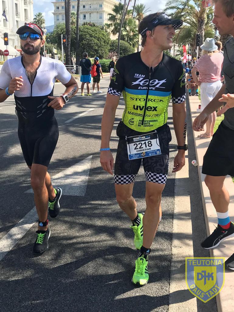 Auf dem Rad fand ich von Anfang an einen guten Rhytmus. Bei km 20 beginnt das Dilemma. Bei einem kurzen Anstieg ging ich aus dem Sattel und wollte schnell über die Bergkuppe, als es plötzlich am Hinterrad butterweich wurde. Fortan hörte ich nur ein klicken und der Hintermann rief "your Wheel" !!! Ich stieg ab und sah das eine Speiche gebrochen war. Nicht so schlimm dachte ich, denn mit einem Zahn weniger im Mund kann man auch noch gut essen. Das Hinterrad spannte ich also wieder ein und fuhr langsam an. Bei einer leichten Bergabpassage mit Tempo 25 dann ein lauter Knall. Reifenschaden Aber auch davon ließ ich mich nicht abhalten und lief ein Stück den Col de Vence mit Fahrrad und Radschuhen hinauf. Bei jeder Kreuzung rief ich" i need a mechanic". Und ich hatte Glück. Das Hinterrad konnte gewechselt werden. Wie ein angestochenes Schwein trat ich in die Pedale und fuhr den Col hinauf. Die anschließende Abfahrt verlangte mir alles ab. In fast jeder Kurve sah ich einen gestürzten Athleten liegen. Mein Ziel war nur noch heil ins Ziel zu kommen.