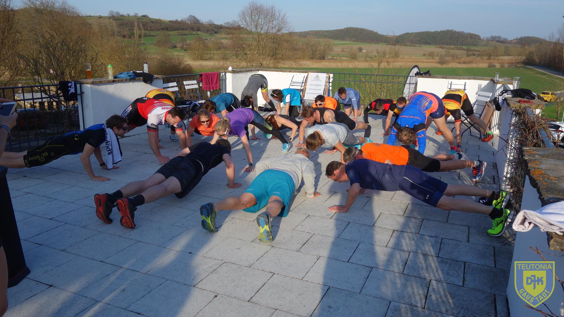 Nachmittags führte uns eine lockere Radausfahrt in drei Gruppen durch den Steigerwald und am späten Nachmittag konnte jeder, der noch dazu in der Lage war, beim Stabi-de-Luxe-Training im Freien teilnehmen. Am Abend hielt Tobias einen Erlebnisvortrag über seinen Transalpine-Run. Abschluss war am Sonntag die Schwimmsession im Bambados.