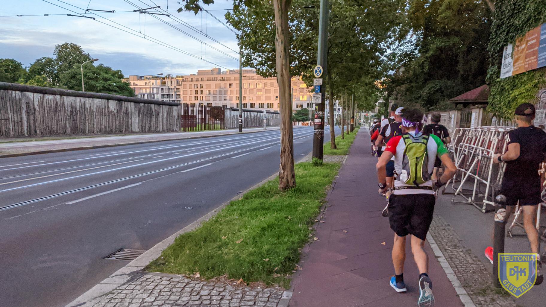 Nach 20:24 Stunden erreiche ich bei Kilometer 148 die Versorgungsstation 24. Es sind nur noch 12 Kilometer! Das Ziel kommt näher, das schaffe ich! Das Knie schmerzt, an Laufen ist eigentlich nicht mehr zu denken, nur noch gehen. Die Zeiten für den einzelnen Kilometer sind zweistellig, aber ich werde es schaffen! Am ehemaligen Mauerstreifen zwischen Reineckendorf und Pankow laufen wir zur Heinz-Brandt-Straße und weiter entlang der Bahnlinie zur vorletzten Versorgungsstation am Bahnhof Wilhelmsruh.