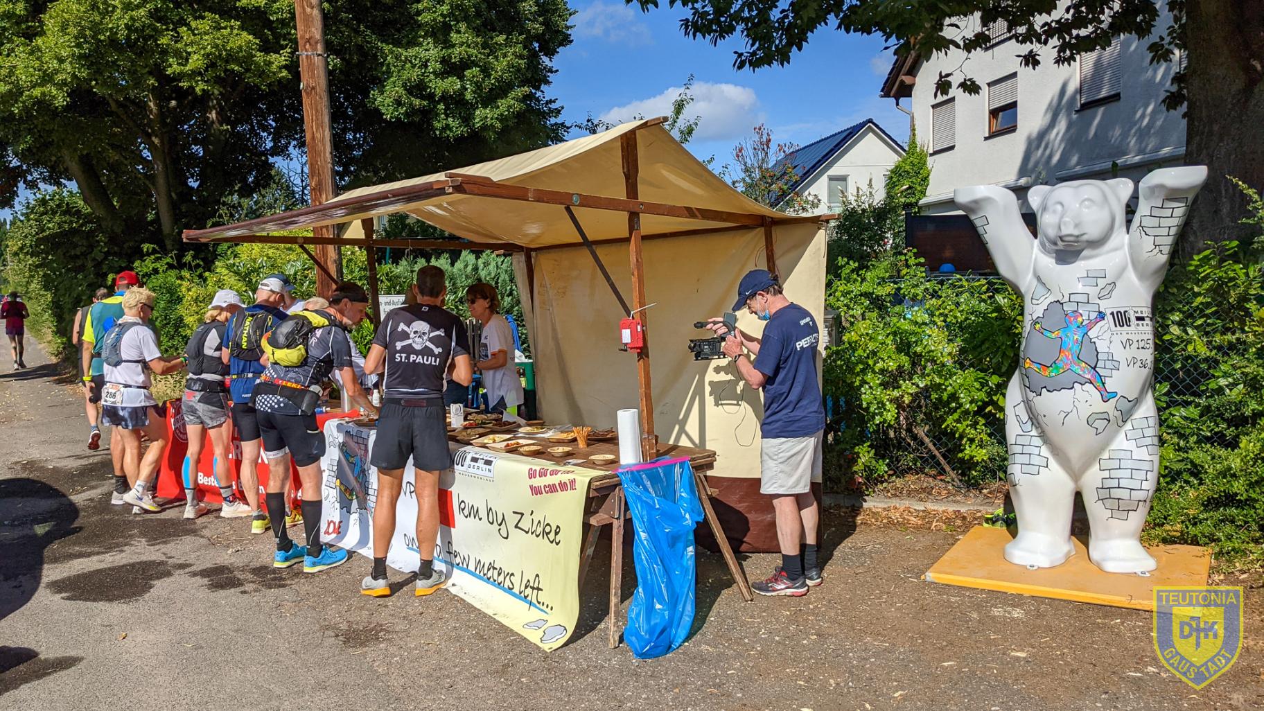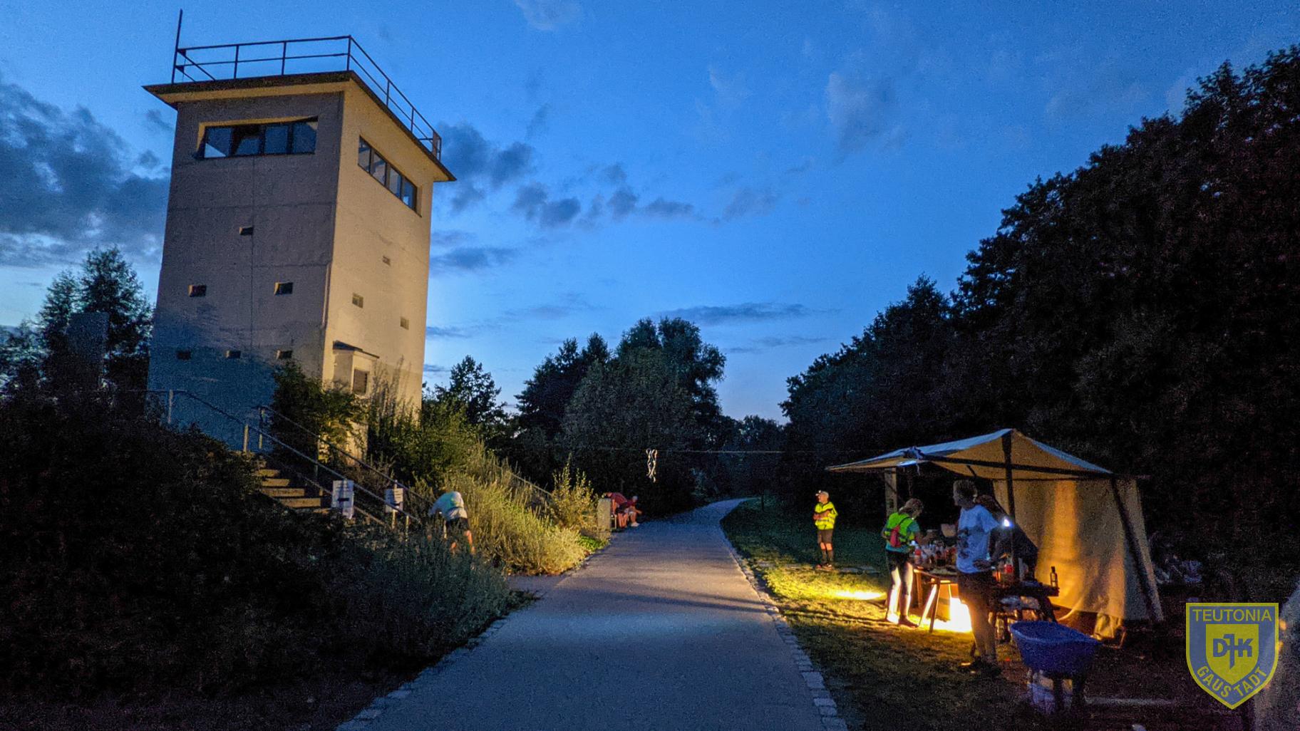 An der Versorgungsstation Falkenseer Chaussee bei Kilometer 110 spürte ich, dass die Anstrengungen der letzten Stunden, aber es ging noch relativ gut. Durch den Spandauer Forst liefen wir nach Schönwalde. Schön langsam wurde es etwas dunkler und die Luft kühlte ab. Es war sehr angenehm zu laufen, wobei mein Tempo langsamer wurde. Es wurde anstrengender… An der Havel entlang liefen wir nach Nieder Neuendorf, wo direkt am ehemaligen Grenzturm eine weitere Versorgungsstation aufgebaut war. 123 Kilometer war ich inzwischen gelaufen, 15:12 Stunden unterwegs und auf Platz 4 in meiner AK.
