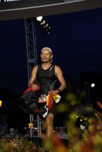 Ich hatte für mich an diesem Tag nur ein einziges Ziel: So viel von dem Rennen aufzusaugen wie möglich und einfach nur genießen. Zeiten und Platzierungen waren absolut nebensächlich und so habe ich beim Start weder Pulsgurt noch Uhr angelegt.Das Schwimmen war klasse. Das Wasser war warm und ich fand weder Strömung noch Wellengang sonderlich störend. So war die erste Teildisziplin gefühlt auch schnell vorbei. Weiter ging es nach einer kurzen Süßwasserdusche in die erste lange Wechselzone. Dort war die Hauptaufgabe, sich einigermaßen mit Sonnencreme zu versorgen, um die gröbsten Verbrennungen zu vermeiden. Auch beim Radeln war dann wieder die Devise, ganz entspannt und locker zu strampeln, sich gut zu verpflegen und noch ausreichend Körner für die Hitzeschlacht beim Laufen auf dem Highway zurückzuhalten.Auch beim Radfahren waren die Bedingungen sehr gut. Im Vorfeld hatte ich von heftigen Seitenwinden gelesen, die leichte Fahrer teilweise von der Strecke geblasen haben. Aber an diesem Tag waren die Bedingungen für mich völlig in Ordnung. Ab Kilometer 149 hatte ich mal leichte Probleme mit einer sich verkrampfenden Oberschenkelmuskulatur, aber ab Kilometer 170 war davon glücklicherweise nichts mehr zu spüren, so dass es zum zweiten Mal in die Wechselzone ging.Auch hier war noch einmal Sonnencreme nachzuschmieren und schon ging es ab auf die Laufstrecke. Jetzt nur noch ein Marathon und schon war es geschafft. Der war dann aber doch etwas zäher als gedacht. Die ersten Kilometer zum Wendepunkt und zurück nach Kona habe ich überhaupt keinen Rhythmus gefunden. Als es dann auf den Highway ging wurde es etwas besser. Problematisch wurde es für mich, als an den Verpflegungsstellen vor dem Energylab das Eis ausging. Da habe ich ziemlich schnell gemerkt, wie der Körper zunehmend überhitzt und ich musste einige Gehpausen einlegen. Auch an den Verpflegungsstellen habe ich mir viel Zeit genommen und soviel getrunken, wie irgendwie reinging. Vielleicht war das auch etwas zu viel. Bei Kilometer 35 habe ich versucht für den „Endspurt“ noch einmal ein Gel zuzuführen, aber das kam sofort wieder raus. Nachdem ich mich einige Male übergeben hatte, ging es mir wieder deutlich besser und mit Einbruch der Dämmerung konnte ich schließlich wieder die Palani-Road in Kona in Richtung Zielkanal hinunter wackeln. Mit Laufen hatte es an dieser Stelle nicht mehr viel zu tun. Die Stimmung der Zuschauer in Kona war fantastisch. Man kommt von dem relativ einsamen Highway und dann in Kona wurden die Menschenmassen immer dichter und der Jubel immer lauter.