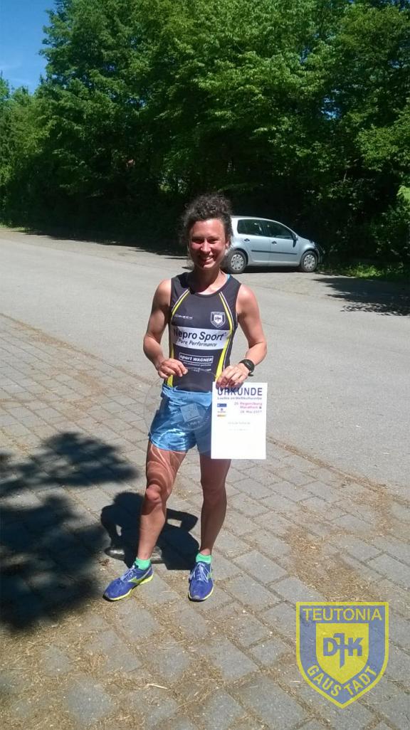 Am vergangenen Sonntag fand in Regensburg der 26. Regensburg Marathon statt. Über 4000 Laufbegeisterte starteten auf den unterschiedlichsten Distanzen vom Bambinillauf bis zum Marathon. Ursula Schürle von der DJK Teutonia Gaustadt entschied sich für den ¾ Marathon über die Distanz von 31,2 km. Hier stellte sie erneut ihre hervorragende Form unter Beweis und konnte mit 8 Minuten Abstand zur 2ten Frau den Sieg in 2:18:32 h für sich verbuchen. Nach ihren 2 Siegen in den letzten 5 Wochen auf der Halbmarathondistanz in Amberg und Schweinfurt war dies der 3. Sieg in Folge. Für Sie nimmt dieser Lauf unter den schwierigen Wetterbedingungen – 33 Grad - einen besonderen Stellenwert ein, da das Laufen bei Hitze „der blanke Horror ist“, so Schürle.