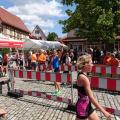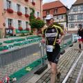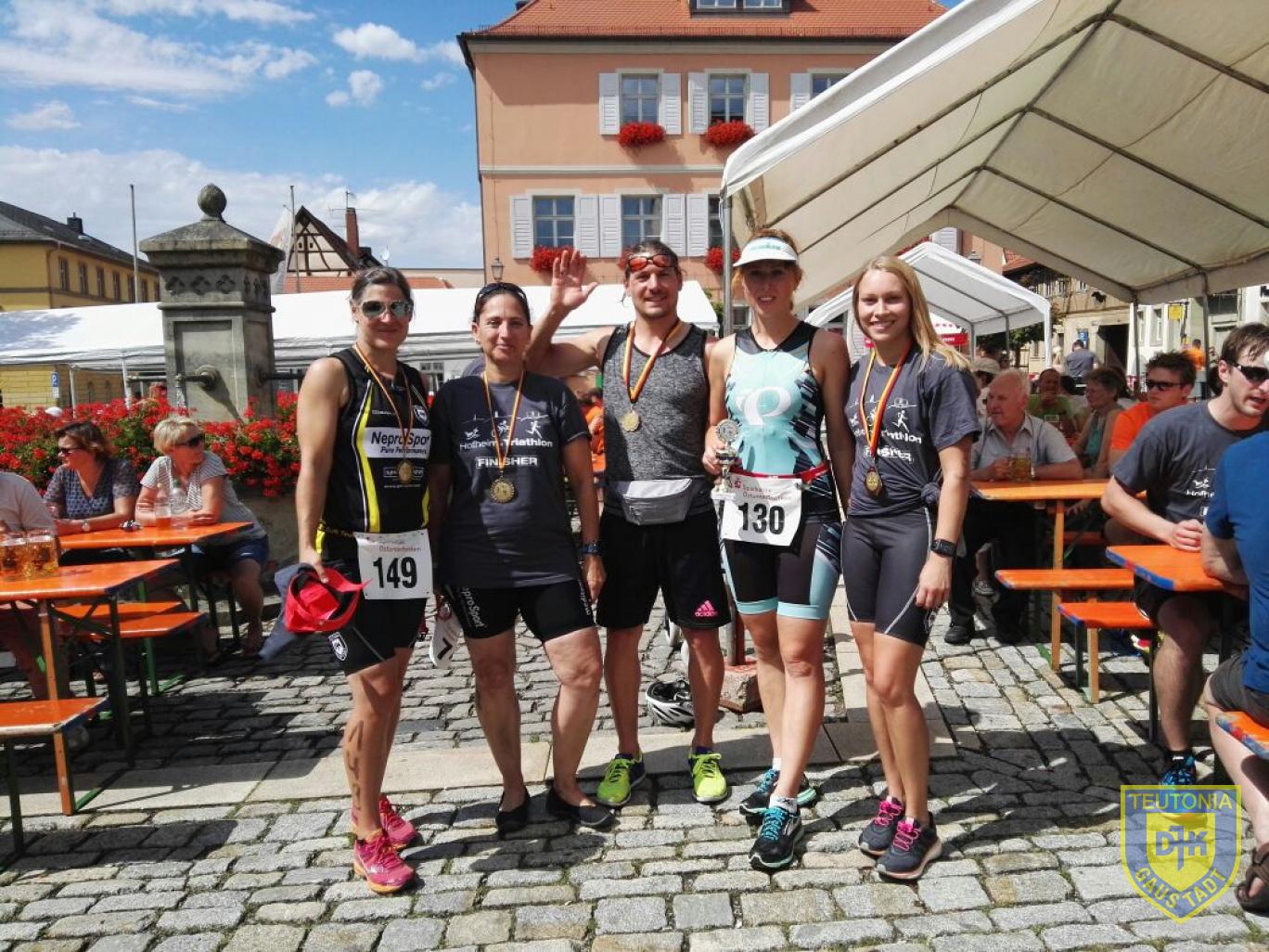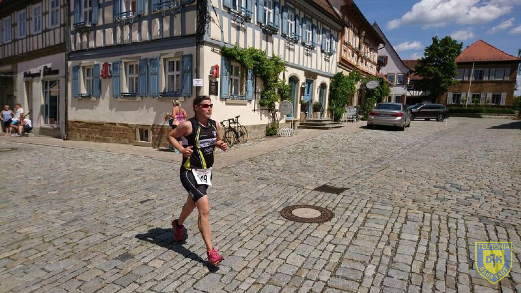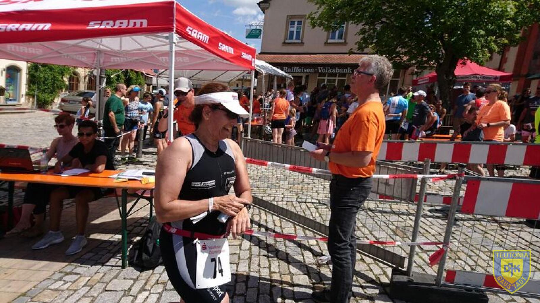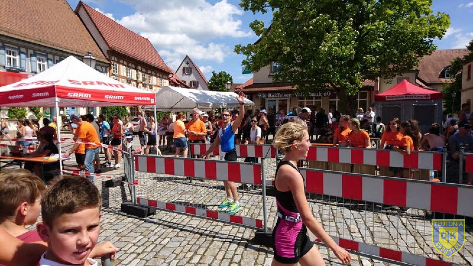 Angekommen am Markplatz hängte jeder Teilnehmer sein Rad mit dem Sattel an die dafür vorgesehene Eisenstange und lief weiter zu seiner Wechselbox mit den zuvor bereit gelegten Laufsachen. Auf der 5km langen Laufstrecke gab es 2 Verpflegungsstellen, so dass man den Körper mit nassen Schwämmen oder Getränken kühlen konnte. Auch hier hatten die Athleten der anderen beiden Distanzen eine längere Strecke mit 2 bzw. 4 Runden auf der Mitteldistanz zu absolvieren. Angekommen im Ziel wartete bereits Gerhard mit einem gekühlten isotonischen Getränk auf mich, daran könnte ich mich direkt gewöhnen. Das war nicht die einzige Überraschung. Es kam noch eine Helferin zu mir, da meine Startnummer wohl bei der Ausgabe vertauscht wurde. Diese wurde zwar geändert, meine Einzelzeiten dabei jedoch komplett aus dem System geschmissen. Kein Problem, nach dem Austausch von 3 unterschiedlichen USB Sticks waren sie wieder da und wir konnten die Siegerehrung starten. Glückwunsch an dieser Stelle zu den erfolgreichen Leistungen der Teutonen.