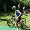 Nachdem der Start um 15 Minuten nach hinten verschoben wurde, die Teilnehmer der Olympischen Distanz wurden vorgezogen, ging es um 11.35 Uhr in das 20,6° kalte Wasser. Das Starterfeld trug auf der gut 700m langen Schwimmstrecke nur teilweise einen Neoprenanzug. Da das Ausziehen mehr Zeit in der Wechselzone braucht entschied ich mich gegen die „Pelle“. Nach der Erfrischung im Wasser ging es auf Radsuche in der Wechselzone. Diese waren nicht nach Startnummern sortiert, sondern nach eigener Platzierung aufgereiht, getreu dem Motto: Wer zuerst kommt, bekommt den besten Platz. Etwas unglücklich gelöst war das Aufsteigen nach der üblichen Linie. Diese bestand aus einer Holzleiste, so dass man das Rad nicht darüber schieben, sondern heben musste.