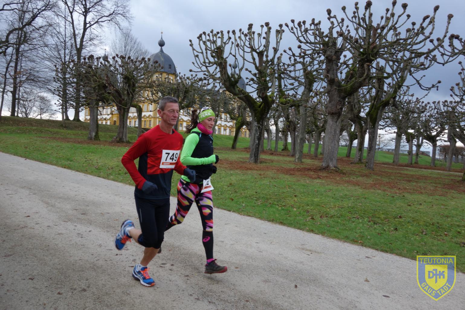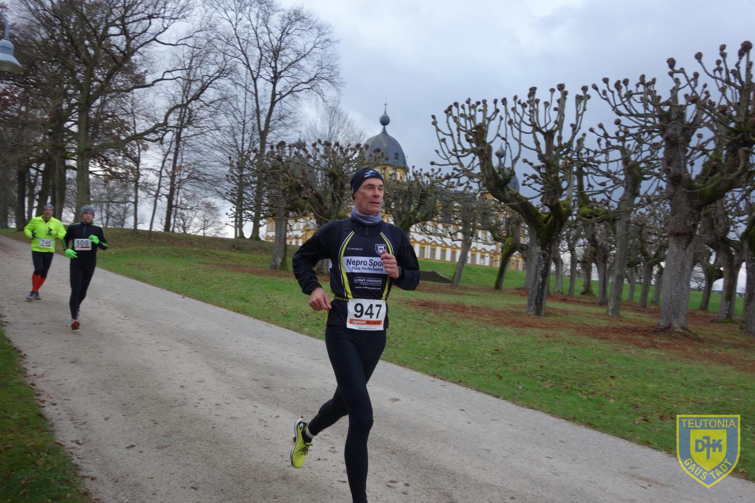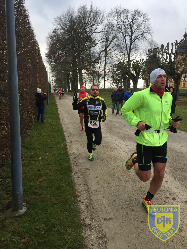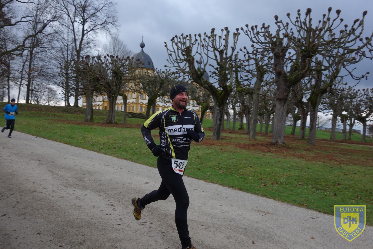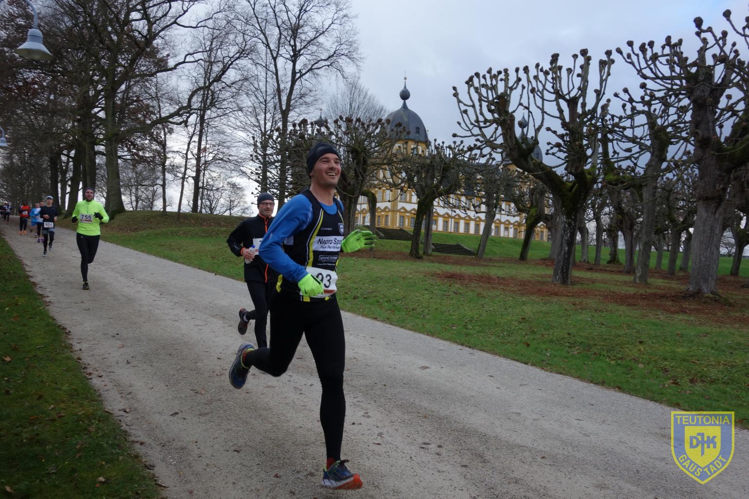 Der Schlosslauf Memmelsdorf ist eine der letzten Gelegenheiten, nochmal eine heiße Sohle auf den Asphalt zu brennen. Bereits zum 33. Mal organisierte der SC Memmelsdorf den Lauf rund um Schloss Seehof. Der Schlosslauf ist auch gleichzeitig der Abschlusslauf des Raiffeisen Cups, der insgesamt aus sechs Läufen besteht. Beim Hauptlauf über 10 km (verteilt auf drei Runden) nahmen auch dieses Jahr zahlreiche Teutonen teil. Die äußeren Bedingungen waren weniger angenehm, es hatte am Tag vorher ordentlich geregnet, so dass der Boden an einigen Stellen zu einer Herausforderung wurde. Auch die Temperaturen waren noch einmal gesunken im Vergleich zu den letzten Tagen. Trotzdem scheuten sich Elke, Judith Heinze, Judith Porzel, Micha, Christian, Christopher, Hans-Rainer, Jens, Karl, Michel, Peter, Stefan, Tobias und Torsten nicht und fanden sich pünktlich um 11:00 Uhr an der Startlinie mit knapp 300 weiteren Läufern ein. Ursel, Johanna und Max waren zur Motivation am Streckenrand und feuerten die Gaustädter ordentlich an.