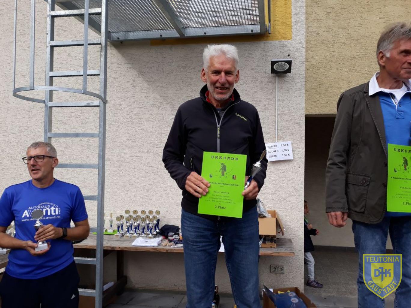 Vier Läufer der Teutonia haben sich am Sonntag, 1. Oktober 2017 zum 4. Auerochsenlauf, den die Leichtathletikabteilung des SV Walsdorf ausrichtete, bei optimalem Laufwetter getroffen. Gelaufen wurde eine Strecke über 10 km. Vom Sportgelände über die hintere Seite des "Schafbergs", durch den Anfang des Steigerwaldes und wieder zurück an den Auerochsengehegen vorbei, über die Walsdorfer "Flussgärten" zum Sportgelände. Die 82 Teilnehmer des Hauptlaufs mussten zudem noch 330 Höhenmeter überwinden. Die Wege waren nach durchregneter Nacht trotzdem gut begehbar und die Luft sauber. So machte das Laufen Spaß. Der Startschuss um 11.15 Uhr war auch zu einer annehmbaren Zeit gefallen.