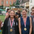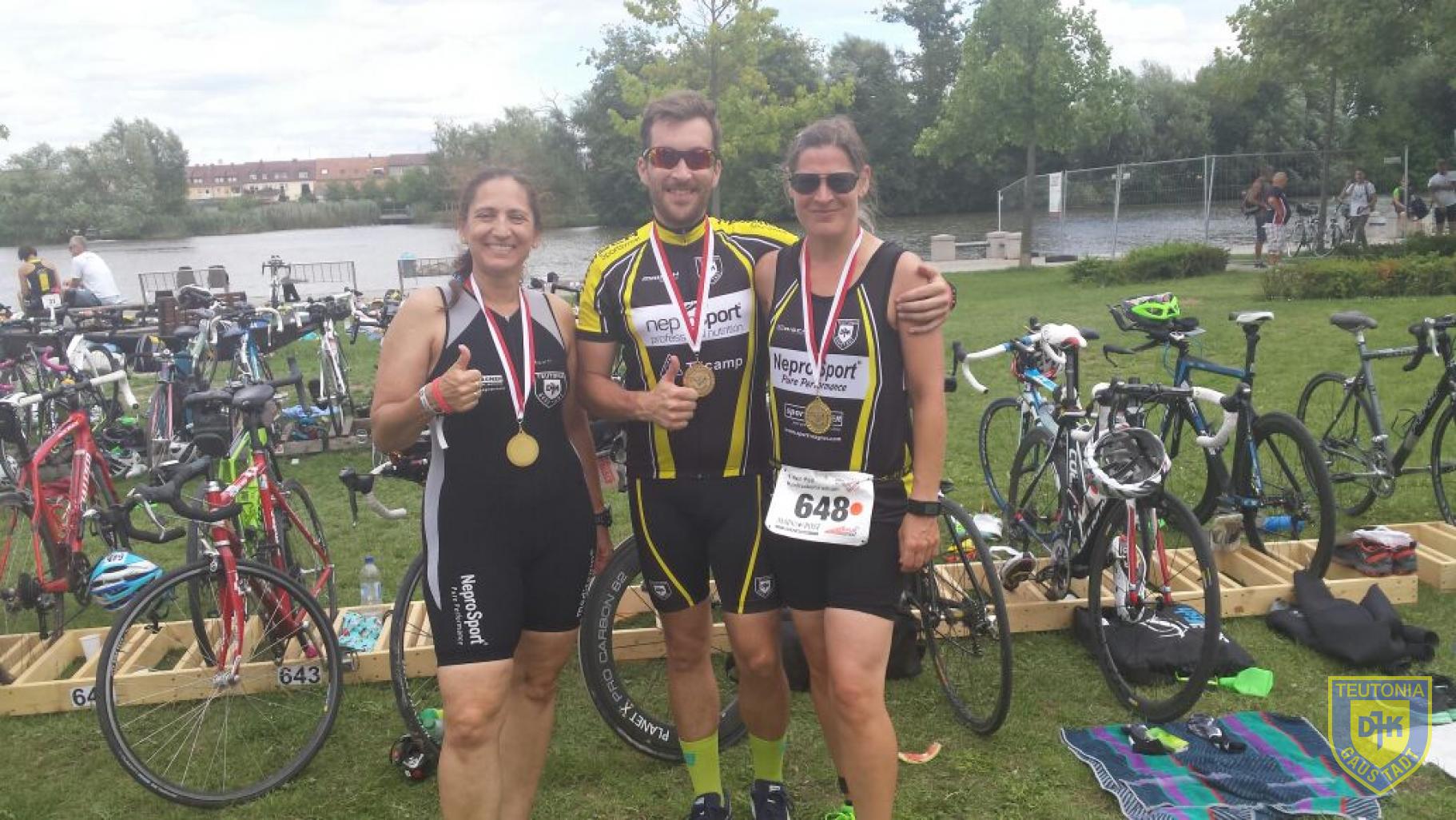 Geschwommen wird im Main, das ganze flussabwärts. Micha begab sich nach der Wettkampfbesprechung zum Schwimmstart begleitet von Sandra, die ihre persönlichen Sachen mit zurück in die Wechselzone nahm. Kurz vor dem Start war die Wechselzone wie leergefegt, nur ein paar andere Staffel-Teilnehmer warteten gemeinsam mit mir auf ihre jeweiligen Schwimmpartner. Der Start verzögerte sich dabei aufgrund des Schiffverkehrs um knapp 15 Minuten. Mittlerweile brannte die Sonne ganz ordentlich. Kurz vor der Volksdistanz starteten die Athleten der Landesliga Nord, die nach wenigen Minuten Schwimmen nur so durch die Wechselzone flogen. Aber nur knapp dahinter stiegen schon die ersten Volksdistanz‘ler aus dem Main. Jetzt wird’s also gleich ernst, Ausschau nach Micha haltend wurde ich doch langsam aber sicher leicht nervös. Nach nur 11 Minuten war Micha am Rad und überreichte mir den Chip. Jetzt bin ich also dran. Die ersten Kilometer führten flach aus Kitzingen heraus, leider blies ein ordentlicher Gegenwind. Nach etwa vier Kilometern ging es einen recht steilen Berg hinauf. Aber wo es rauf geht, geht es auch wieder runter. Und so konnte ich fast die gesamte Reststrecke ordentlich in die Pedale treten und übergab den Chip nach 38 Minuten an Sandra. Zeit zum Verschnaufen! Nach 01:16:39 liefen „die Unbelehrbaren“ schließlich zu dritt über die Ziellinie und nahmen unsere Medaillen in Empfang. In der Staffelwertung erreichten wir einen souveränen dritten Platz bei dem Mixed-Staffeln. Zufrieden warteten wir auf Christian und schlugen uns die Bäuche voll. Danke an meine beiden Mitstreiterinnen, hat riesigen Spaß gemacht!