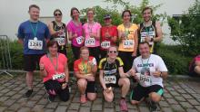 Nach knapp zwei Stunden Fahrt hieß es zunächst, die Startunterlagen abzuholen. Kurz vor dem offiziellen Start um 16:45 fanden wir uns im Stadion in der mittlerweile komplett überfüllten Startaufstellung wieder. Knapp 4000 Lauf10er aus ganz Bayern waren hier heute am Start, eine beeindruckende Kulisse. Gestartet wurde in vier Wellen im Abstand von wenigen Minuten. Wir starteten in der letzten Welle kurz vor den Walkern um kurz nach 17:00 Uhr. Die Anfangsnervosität verflog aber sehr schnell wieder. Rita und Tobias wurden von Sandra begleitet, Alex, Nicole und Steffi liefen gemeinsam mit Stefan und mir und Denise und Martina unterstützen Dagmar. Von Beginn an lief es richtig rund und wir kamen gut voran. Nach einem kurzen Stück auf der asphaltierten Straße ging es über Wald- und Flurwege in die Natur rund um Wolnzach, vorbei an Wäldern, Hopfenfeldern und kleinen Seen. Unterwegs wurde für reichlich Verpflegung gesorgt, fast alle zwei Kilometer gab es Wasser- und Obststände. Ein weiteres Highlight war eine Gruppe Alphornbläser, die uns kurz vor dem Ende der „Wolnzacher Wand“ begrüßten. Und wie es immer ist, wo es hoch geht, muss es auch wieder runter gehen. So verlief der Rest der Strecke bergab bis in die Ortschaft Wolnzach. Auf dem Marktplatz sahen wir auch schon das Zieltor. Die Freude, die Strecke ohne größere Anstrengungen bewältigt zu haben war unseren Lauf10er deutlich anzusehen. Voller Stolz holten wir uns unsere Medaillen ab.
