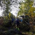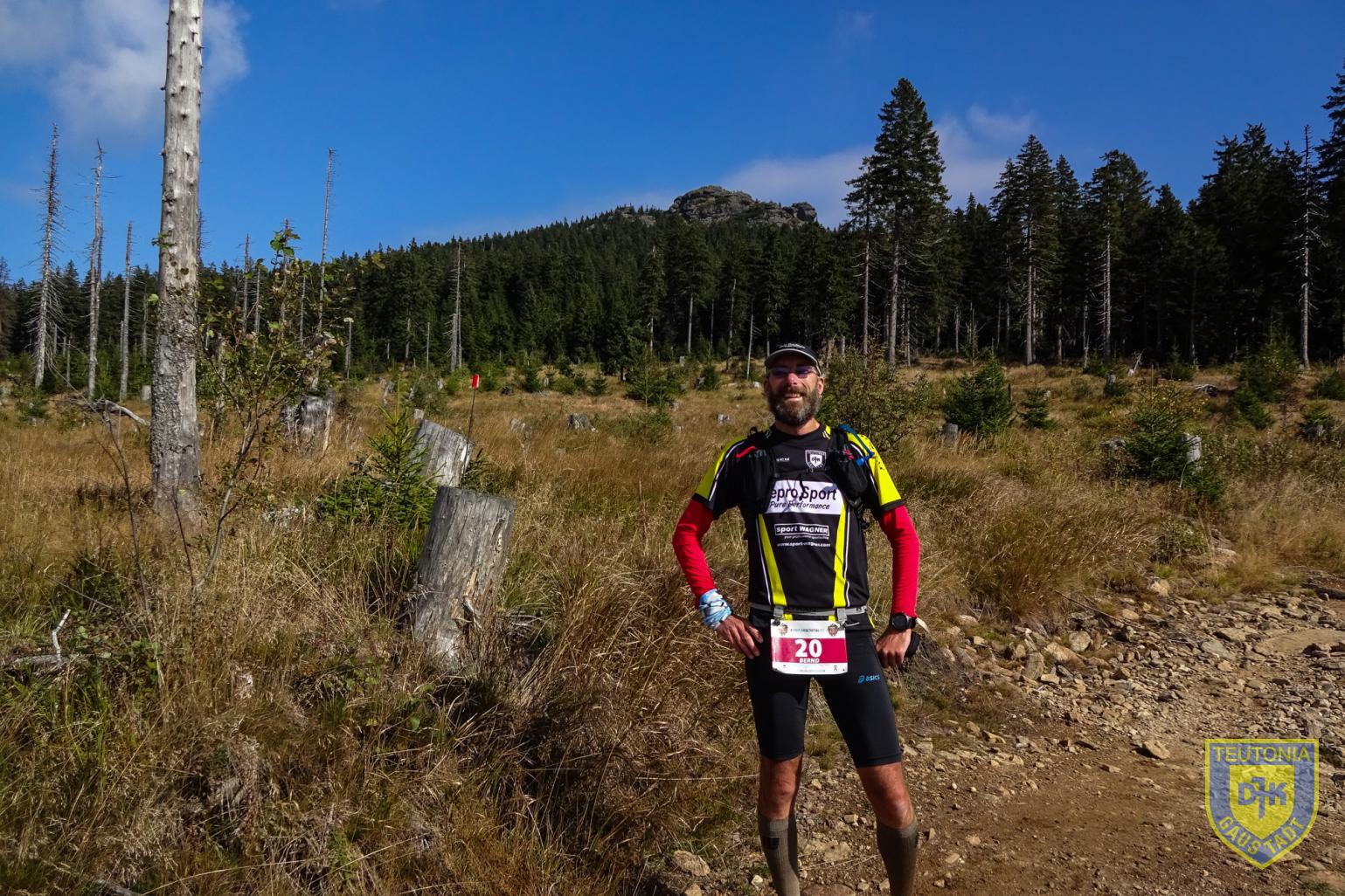 Kurz vor km 30 erreichten wir die sehr schön gelegene Versorgungsstation „Tausender“ und waren erstmalig auf 1000 Meter. Nach wenigen Minuten schwenkten wir zwischen Enzian und Kleiner Arber auf den Goldsteig, dem wir über den 1384 Meter hohen Kleinen Arber folgten. Uns bot sich eine spektakuläre Aussicht über die umliegende Landschaft mit den vielen abgestorbenen Bäumen und der sich verfärbenden Natur. Kurz vor dem Gipfel hieß es kraxel: Es ging über hohe Felsen direkt zum Gipfel mit Gipfelkreuz. Nach einer Verschnaufpause und einem Rundblick auf der anderen Seite wieder runtersteigen und auf einem technisch anspruchsvollen Downhill etwa 150 Hm bergab. Wir wussten ja, was nun kommt… der Anstieg zum Großen Arber… Nochmals knapp 2 km steiler Anstieg mit vielen Treppenstufen, aber einer tollen Landschaft! Oben angekommen, hieß es erst mal durchatmen. Etwas ungewohnt war es hier oben, waren doch so viele Menschen hier. Da merkte man wieder, auf den Berg führt eine Seilbahn… Die Strecke verlief kurz unterhalb des Gipfelkreuzes vorbei und anschließend sofort wieder bergab zum Arberschutzhaus, wo die nächste Versorgungsstation wartete. Hier fiel es schwer, sich von den ganzen Leckereien loszureißen und weiterzulaufen, aber die Kraft war noch da und das Laufen machte einfach Spaß! Über den Arberweg ging es nun auf dem technisch schwierigsten Abschnitt des gesamten Rennens zum großen Arbersee auf 940 Meter. Der Weg war größtenteils ein felsiger Pfad, der absolute Trittsicherheit und Konzentration erforderte, aber absolut genial zum Laufen war!