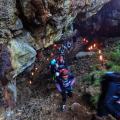 Nach dem Start geht es kurz durch den Ort, um warm zu werden, denn nach dem ersten Kilometer beginnt bereits der erste Anstieg zum 955 Meter hohen Silberberg. Auf dem Weg passieren wir eine Höhle, die von Fackeln beleuchtet wird und können von oben die Aussicht genießen. In den Tälern hängt der Nebel und nur die Bergspitzen erheben sich über dieses Meer. Über schöne Wege, auf denen man es gut laufen lassen kann geht es gleich wieder bergab, bevor der nächste Anstieg zum 983 Meter hohen Kronberg beginnt. Auf dem Weg zum Berg erreichen wir die erste Versorgungsstation und schnell wird klar, den Läuferinnen und Läufern wird es an nichts fehlen: Es gibt heißen Tee, ISO-Getränke, Wasser, Bier, verschiedene Obstsorten, Semmeln, Käsewürfel, Nüsse, Tomaten, Gurken, Kuchen, Süßes und Gels. Nach einem kurzen Aufenthalt geht es weiter auf schmalen Waldwegen bergauf. Die Strecke ist durchgängig mit kleinen roten Fähnchen und lila Pfeilen markiert, was ein verlaufen verhindert. In einem ständigen Auf-und-Ab führt die Strecke an der 869 Meter hohen Strohmannhanselhöhe vorbei und über die 914 Meter hohe Harlachberger Spitze.