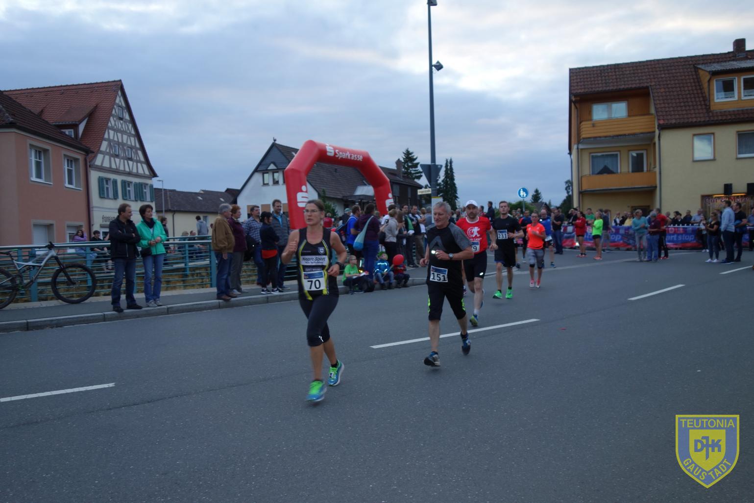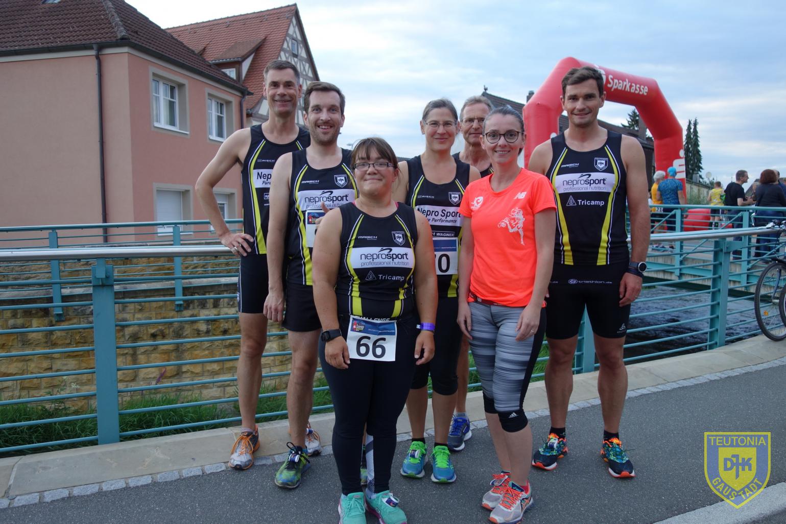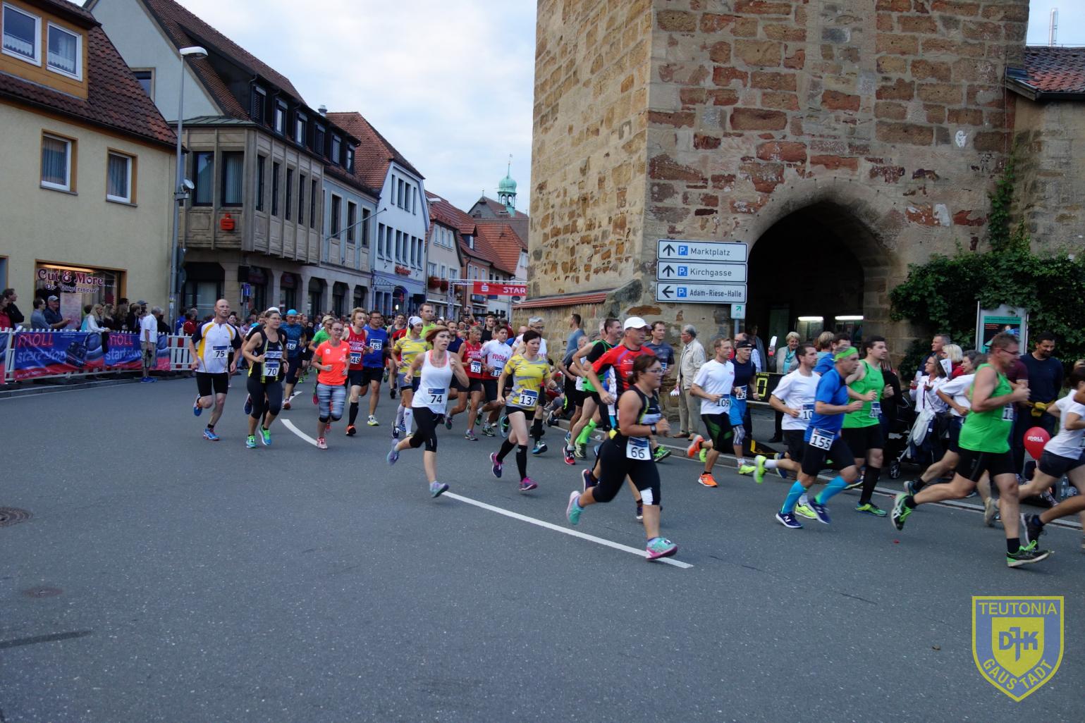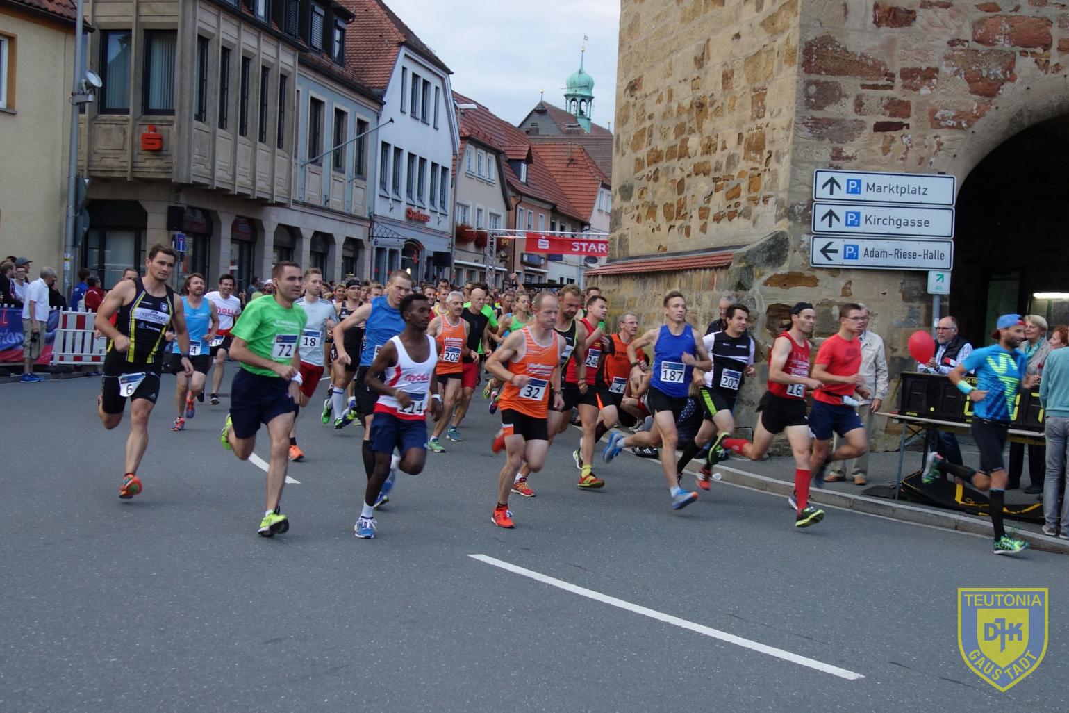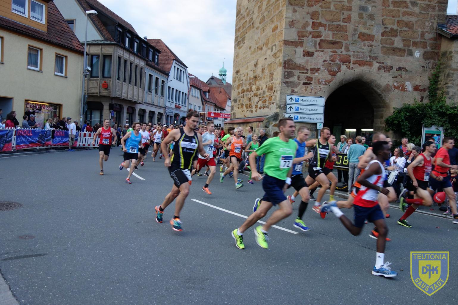 Am vergangenen Freitag, dem 28. Juli 2017, war es so weit, der Adam-Riese-Nachtlauf in Bad Staffelstein stand auf dem Programm. Dank einer freundschaftlichen Kooperation zum ausrichtenden Verein TSV 1860 Staffelstein, konnten fünf Teutonen auf Einladung starten. In Summe standen so 7 Teutonen an der Startlinie am Stadtturm, als um 20:30Uhr Elisabeth Moll, Patriarchin des Batterieunternehmens MOLL, den, aufgrund Hemmung der Pistole, verzögerten Startschuss gab.