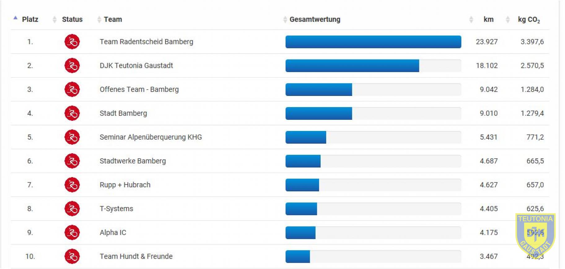 Das Team DJK Teutonia Gaustadt erzielte bei den geradelten Kilometern mit 18102 und bei den Kilometern pro Teilnehmer mit 503 jeweils den 2. Platz.