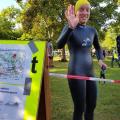 Bei der Wettkampfbesprechung erfuhren wir, dass den Startern auf der Mitteldistanz das Tragen des Neos erlaubt war. Die Freude aber auch Aufregung stiegen jetzt mit jeder Sekunde…frisch eingecremt mit Sonnencreme kämpfte ich mich in meinen Neo – nicht die beste Idee J und dann ging es auch schon zum Einschwimmen!