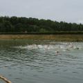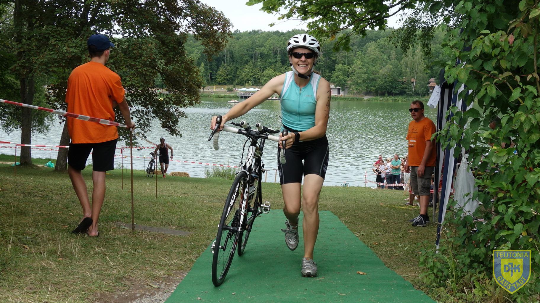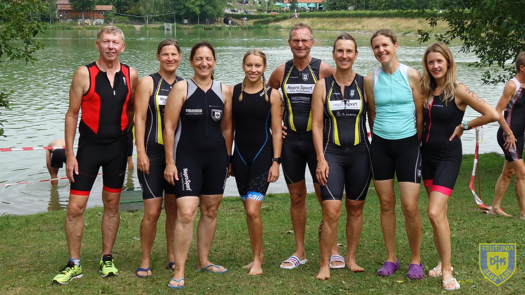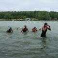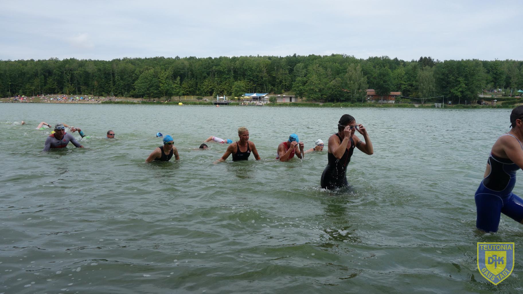 Gegen 11 Uhr ging es für uns Teutonen, bis auf Aika, für die der Startschuss bereits um 9.30 Uhr für die Mitteldistanz fiel, zur Wettkampfbesprechung. Danach kurzes Einschwimmen und nur wenig später gings los für die Olympische Distanz, für die sich Karl, Ramona, Julia, Claudia und Heike bereit machten. Schuss und ab für 1500m schwimmen mit einem Landgang!