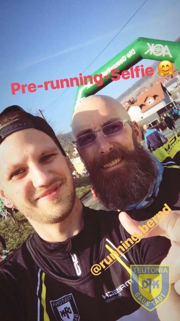 Durch Zufall erfuhr ich vom Saaletal-Marathon in der Nähe von Bad Kissingen. Da dort mein Onkel wohnt, haben wir uns zum gemeinsamen Mittagessen nach dem Lauf verabredet. Wir fuhren am Samstag früh um 8 Uhr los und kamen ca. um 9 Uhr dort an, genau richtig um meine Startunterlagen (ein sehr umfangreiches Paket mit Flyern, Probierpackungen, 2 Flaschen Wasser etc.) zu holen und mich mit Bernd (der den Marathon lief) zu treffen. Nach ein paar obligatorischen Bildern und etwas Smalltalk, widmeten wir uns dem Aufwärmen und dem Sichern eines guten Startplatzes. Wir positionierten uns recht weit vorne, um nicht so stark ins Getümmel zu kommen.