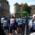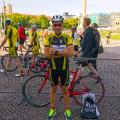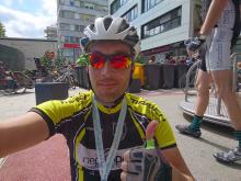 Dann war es soweit, es ging endlich los. Direkt durch die gesperrte Innenstadt von Stuttgart ging es raus Richtung Osten. Der Flache Kurs und das Fahren in einer größeren Gruppe ermöglichte eine irre Geschwindigkeit, 45 km/h waren locker drin, teilweise trat ich sogar über 50 km/h ohne größere Anstrengung. Aber mir war schon klar, dass das nicht ewig so weiter gehen würde, schließlich warteten ja noch rund 1300 Höhenmeter auf mich. Einfahrt in einen zweispurigen Tunnel, das einzige was man hörte war das irre Summen und Surren hunderter Laufräder auf dem Asphalt, Gänsehaut-Moment. Nach knapp 25 km dann die erste Steigung, die aber dann gefühlt auch schnell bewältigt war. Ich hatte mir die Strecke zwar mehrfach angeschaut und wusste auch, wo ich langfahren würde, aber während des gesamten Rennens hatte ich nur in wenigen Momenten wirklich eine Ahnung, wo ich jetzt genau war. Der Tunnelblick und der Rausch waren größer als gedacht. Durch Kirchheim unter Teck hindurch ging es dann weiter Richtung Norden durch das Nassachtal Richtung Schorndorf. Ziemlich langgezogene Steigung, bei der es auch über den höchsten Punkt der Tour ging. Bei der Abfahrt passierte es dann doch: An einer Kreuzung innerorts hab ich mich arg verschätz mit der Geschwindigkeit und bin dann nur noch scharf bremsend geradeaus gefahren. Glücklicherweise war die Straße hier nicht zu Ende und ich kam mit einem leichten Schrecken davon. Die Kette nach der Abfahrt fast ganz rechts dauerte es einige Momente, bis ich wieder in den Tritt gekommen bin. Kurzer Blick auf die Uhr: bereits 80 km in den Beinen. Ab diesem Moment ging der Kampf mit mir selbst los. Ich zählte jeden einzelnen Kilometer. Nach etwa 90 km wurde es dann richtig hart: Für eine Autobahnüberführung ging ich kurz aus dem Sattel und wollte im Wiegetritt hoch, als ich merkte, dass meine Oberschenkel begannen, zuzumachen. Na super, ich hatte immer noch im Hinterkopf, dass mich der Pragsattel auf den letzten Kilometern erwarten würde. Mit ordentlich Kraft zu treten war also nicht mehr drin. 25 km vor dem Ziel zeigte die Straßenbeschilderung Stuttgart nach links, Ludwigsburg nach rechts. Und das gesamte Fahrerfeld bog nach rechts ab! Mittlerweile schmerzten die Beine auch beim normalen Treten. Irgendwann kam jedoch das Ortsschild von Stuttgart und ich versuchte so gut es geht mit zu schwimmen. Immer wieder überholten mich „Züge“, ich hatte aber nicht ansatzweise das Gefühl, hier aufspringen zu können. Ich kam mir vor wie in einer alten rostigen Draisine. Für den Bruchteil einer Sekunde überlegte ich, kurz abzusteigen und mich an den Straßenrand zu legen. Aber der Gedanke verschwand schnell wieder. Weiter geht’s, nur noch wenige Kilometer! Und dann kam er, der Pragsattel! Ein gefühlt 25 % nicht enden wollender Anstieg. Irgendwann muss es doch bergab gehen? Entschädigt wurden die Teilnehmer für eine schöne Aussicht von oben auf die Stuttgarter Innenstadt, für die ich in diesem Moment aber weiß Gott keinen Blick hatte. Die letzten Kilometer. Es ging bergab, vorbei an der Universitätsbibliothek, mein Arbeitsplatz. Dann konnte es ja nicht mehr weit sein. Die Schilder kündigten es an, nur noch 500 Meter. Einige Fahrer um mich herum setzten zum Zielsprint an. Für mich überhaupt nicht dran zu denken, ich überlege mir, wie ich vom Rad kommen soll ohne zu krampfen. Vielleicht einfach seitlich an die Bande fallen lassen. Die letzten Meter, die Zuschauer stehen entlang der Strecke und machen ordentlich Krach, Sandra ruft mich und winkt mir zu. Schließich die Ziellinie: Geschafft, nach 3:41 h war die 117,5 km lange Strecke bezwungen. Die ca. 500 Meter lange Ausrollzone brauche ich nur wenige Meter, nichts geht mehr. Absteigen ging dann überraschender Weise doch ganz gut. Nach dem Empfang der wohlverdienten Medaille wollte ich mich nur noch hinlegen. Was für eine Erfahrung, ich gestehe mir ein, die Sache vielleicht doch ein klitzeklein wenig unterschätzt zu haben. Sandra findet mich und versorgt mich mit einem alkoholfreien Weizen. Der Schmerz lässt nach und nach ein paar Minuten kann ich wieder einigermaßen gehen.