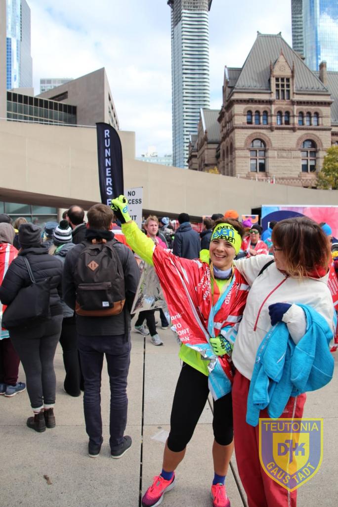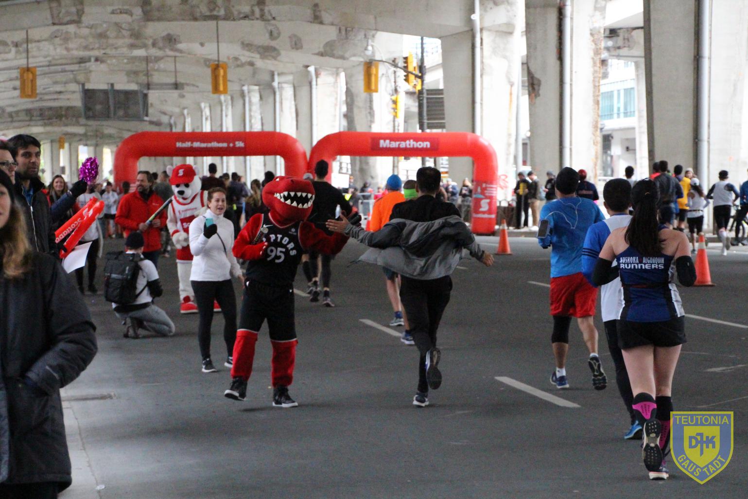 Startschuss war am Sonntagmorgen um 8.45 Uhr bei windigen 0 Grad. Nach der kanadischen Nationalhymne liefen die Corrals schwarz, rot, gelb, blau, grün, orange und lila nacheinander mit jeweils passendem farblichen Konfettiregen los. Kurzentschlossen habe ich mich bei einem Pacer für 4 Std 10min angehängt, wohl wissend, dass ich das Tempo nicht auf die volle Distanz schaffe…😉. Die Stimmung auf der ersten Hälfte war absolut gigantisch! Alle 3 km Verpflegungsstellen die Wasser und Gatorade anboten, insgesamt gab es zusätzlich noch 4- oder 5-mal Energiegels. Bis Kilometer 21 lief auf der fast flachen Strecke alles super, ich blieb gut an dem Pacer dran…. bis der Blödmann an einem Medical-Zelt bei km 22 einfach ausstieg! Bei eisigem Wind hieß es dann halt alleine durchbeißen. Die zweite Hälfte war stimmungstechnisch etwas ruhiger, jedoch mit toller Aussicht auf den Ontario See. Eine Überraschung gab es dann noch, als ich mir auf den letzten Kilometern ein kanadisches „Energy-gel“ gönnte. Auf der Packung stand tatsächlich Energy–gel, bestehend aus: 100% kanadischem Ahorn Sirup!