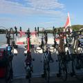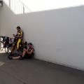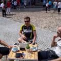 Geweckt von der Geräuschkulisse einer erwachenden Großstadt sollte es am fünften Tag zur letzten Etappe gehen. Heute einmal kein obligatorisches Verstauen der persönlichen Sieben Sachen in die Radtaschen, denn wir kehren heute Nacht zurück. Gegen 09:00 Uhr ging es los, mitten durch die Wiener Donaustadt auf der Wagramer Straße. Ein kurzes Frühstück ausnahmsweise unterwegs beim örtlichen Bäcker. Die letzte Etappe sollte deutlich kürzer werden als die bisherigen und wir ließen es locker angehen. Immer entlang der Donau Richtung Süd-Osten verpassten wir die Abzweigung, die uns eigentlich um das Zentrallager Lobau im Süden Wiens führen sollte. Ein ortskundiger Rennradler half uns aber und so waren wir schnell wieder auf Kurs. Zu viert nebeneinander rollten wir Richtung Slowakei. In Hainburg an der Donau führte der Weg direkt entlang der alten Stadtmauer, die mit 2,5 Kilometern Länge, seinen drei erhaltenen Toren und 15 Türmen eine der ältesten und am besten erhaltenen Stadtbefestigungen Europas darstellt. Eine kurze Pause in Hainburg trennte uns noch von der Einfahrt nach Bratislava. Und dann war es soweit: Über die Brücke des Slowakischen Nationalaufstandes überquerten wir die Donau und fuhren direkt auf die hoch über der Stadt liegenden Burg zu. Nach einem ausgiebigen Mittagessen in der Innenstadt besuchten wir zunächst St. Elisabeth (Blaue Kirche), erklommen den Burgberg mit den Rädern und betraten die Altstadt von Bratislava durch das Michaelertor, dem einzig erhalten gebliebenem Tor der mittelalterlichen Stadtbefestigung von Bratislava. Zurück ging es am Abend mit dem Twin City Liner, ein Katamaran, der die Strecke Bratislava – Wien in nur 70 Minuten zurücklegt. Auf dem Weg zum Anleger dann noch eine kleine Überraschung: Ole saß mit seinem Bruder und seinem Vater gerade beim Essen, so dass wir uns noch kurz unterhielten. An Bord der Fähre dann: Zeit für soziologische Studien. Was es so für Menschen gibt, ist doch immer wieder faszinierend. Die Ankunft in Wien planmäßig, auf dem Radschnellweg durch die Wiener Innenstadt zurück in unser Domizil. Den Abend ließen wir im Donau Zentrum ausklingen, weiter schafften wir es heute nicht.