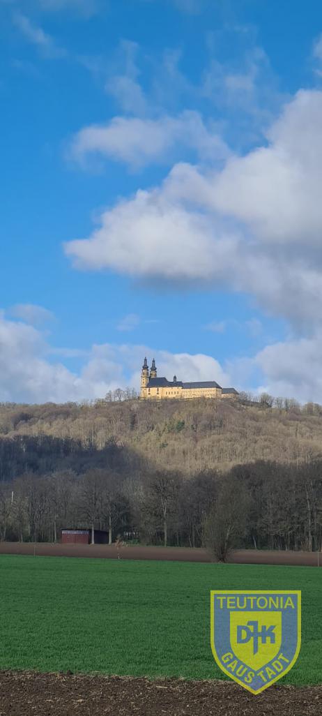 Dann wieder ins Tal um auf der anderen Seite wieder aufwärts nach Vierzehnheiligen zu laufen. Unfreundlicher konnte das Wetter nicht sein. Kalter Wind, ab und zu Sonne machten das laufen zu keinem Vergnügen. Wenigstens lag auf der Ebene zum Staffelberg kein Schnee mehr. Wären wir 1 Tag früher gelaufen hatten wir auch noch durch den Schnee laufen müssen. Aber so ganz kamen wir um das Thema Schnee nun doch nicht herum, denn Graupelschauer begleiteten uns dann staffelbergabwärts noch bis Unterzettlitz. Aber wir trotzen dem Wetter und erreichten wohlbehalten das Ziel und ließen den Tag in der Obermain Therme ausklingen.